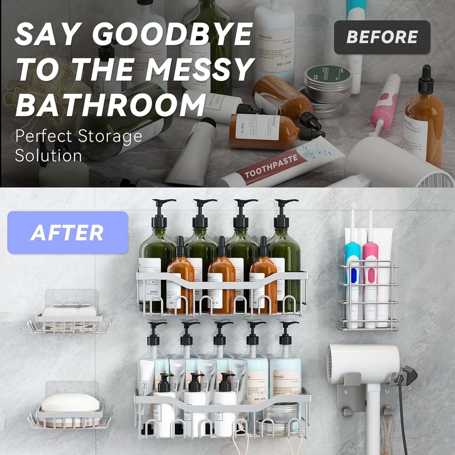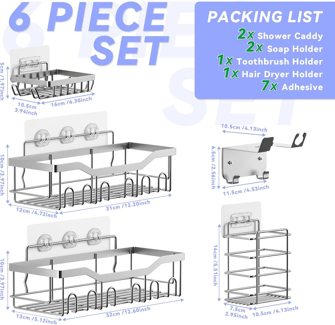 - Vielseitig einsetzbar: Sie erhalten eine packung- 2 x Badezimmerregal, 2 x Seifenhalter, 1 x Zahnbürstenhalter, 1 x Haartrocknerhalter, 7 x Klebstoff, 1 x Manual. Unser vielseitiges Duschgelhalter kann im Badezimmer, in der Küche oder in jedem Raum