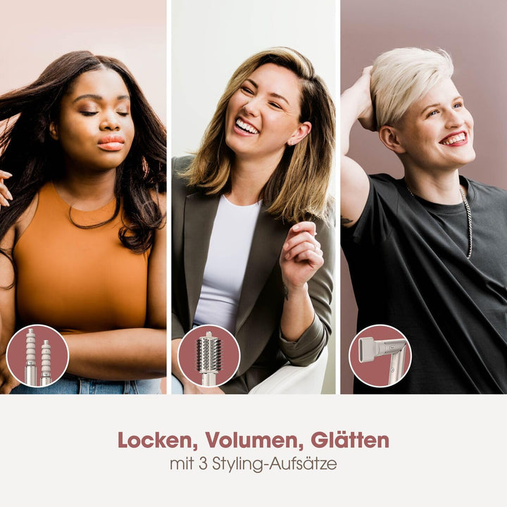 - 3 STYLING-MÖGLICHKEITEN: Locken, Volumen verleihen, Geschmeidigkeit für Ihr Haar mit 3 Stylern: Auto-Wrap-Lockenwickler, Ovalbürste und Konzentratordüse