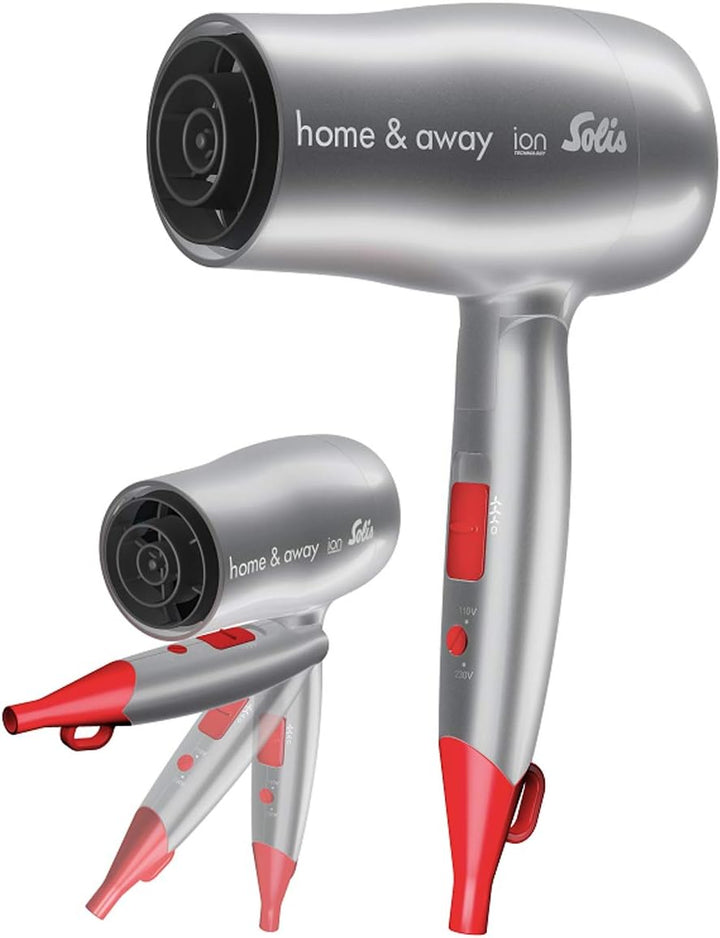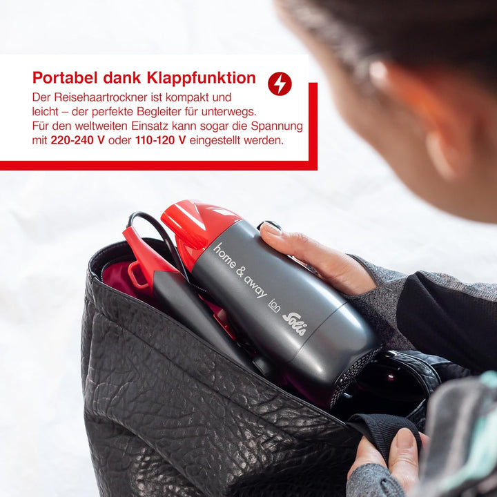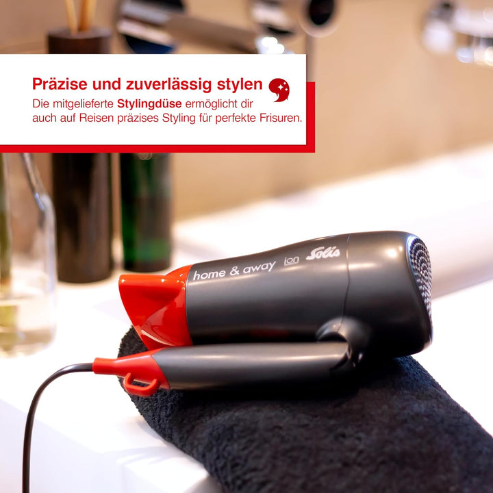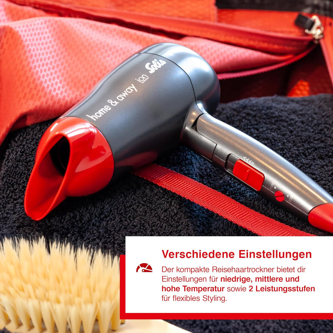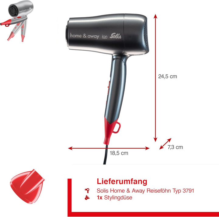 - LIEFERUMFANG - Solis Home & Away 3791 Reise-Haartrockner, inklusive Stylingdüse, Gewicht: 310 g, Material: Kunststoff, Masse: 12 x 8, 5 x 22 cm, Kabellänge: 1, 8 m, Farbe: Anthrazit/Rot