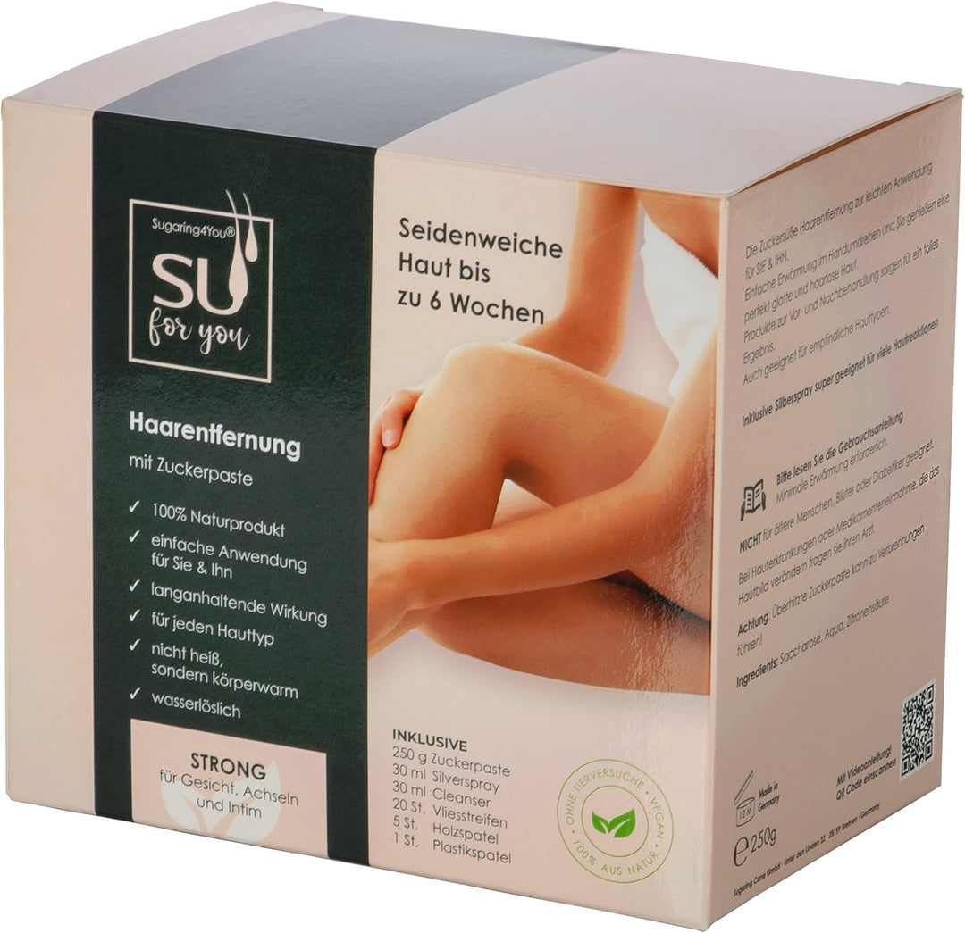 - ⭐ Professionelles ENTHAARUNGSGEL-SET von Sugaring Cane mit Video-Anleitung inklusive Zuckerwachs Extra-Soft 250g, 1x Plastikspatel, 5x Holzspatel, 20x Vliesstreifen, sowie Body-Cleanser 30ml und Silber-Spray 30ml zur Vor- & Nachbehandlung