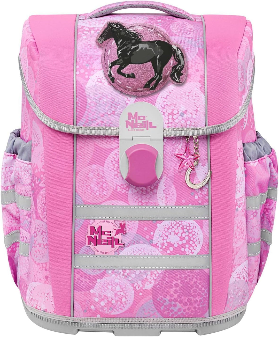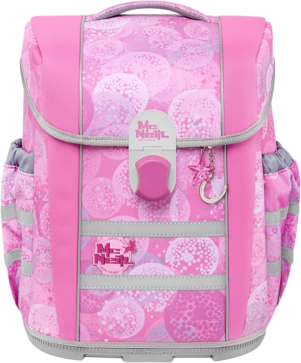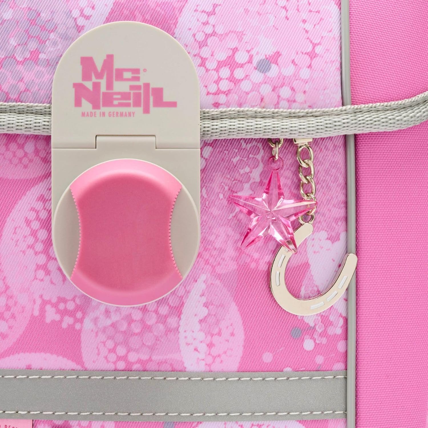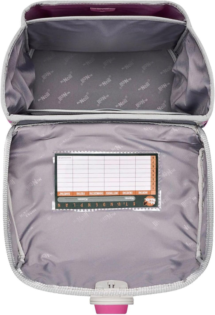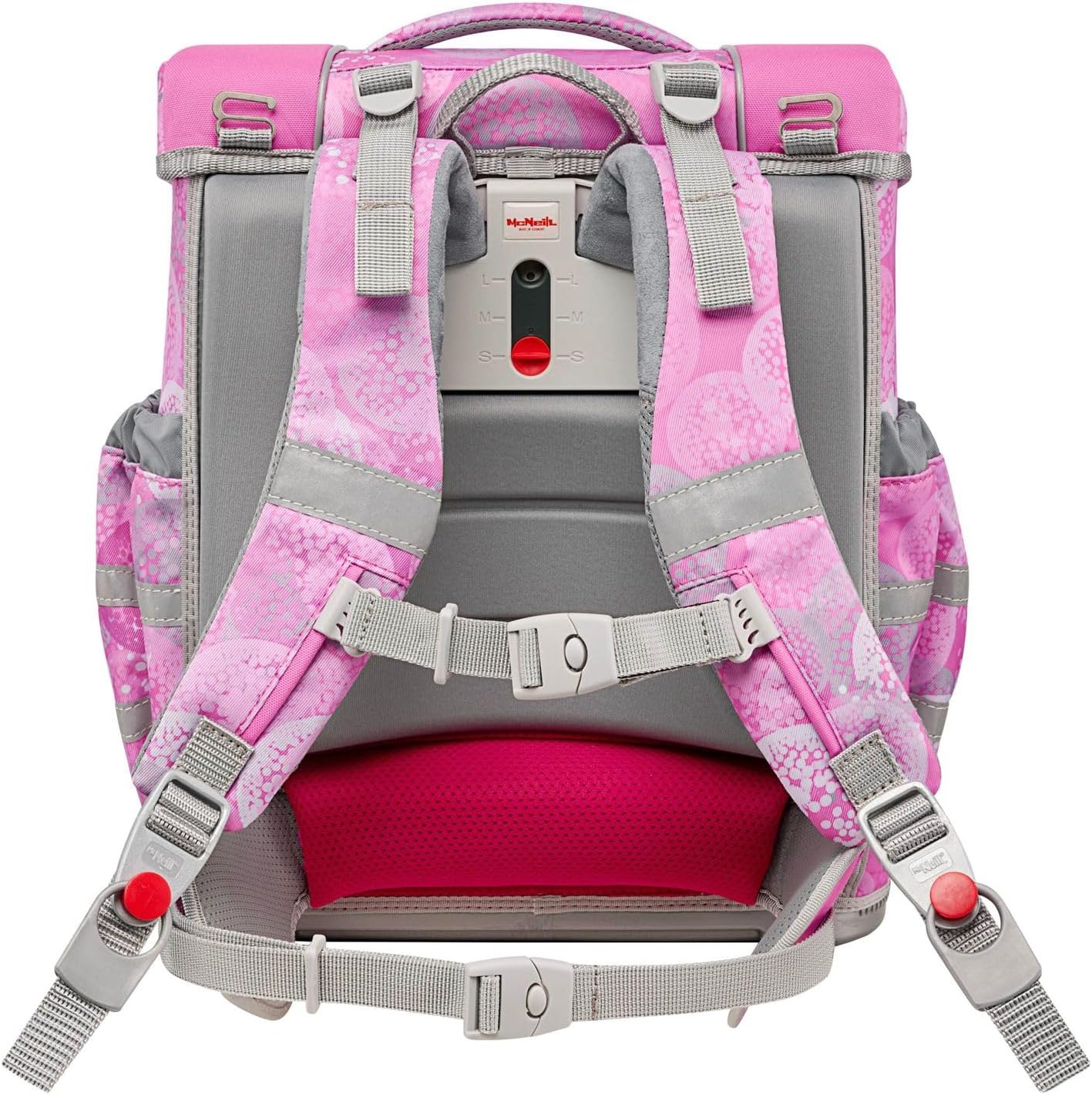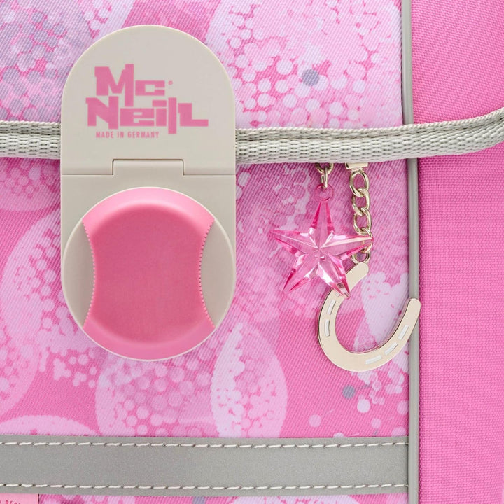 PRODUKTBESCHREIBUNGEN McNeill Schulranzen in einmaligem Muster Lieferumfang McNeill Set: o Schulranzen mit Etikett, Stundenplan, Beckenflosse, McTaggie o Schlüsselanhänger mit Etikett und Schlüsselring o Mäppchen (Schlamperetui) mit Etikett o Mäppchen (Federmäppchen) mit Etikett und Stundenplan, Geodreieck, Lineal, Radiergummi, Spitzer, Buntstift, Bleistift o Sporttasche (Sportbeutel) mit Etikett Daten Schulranzen: o Masse: Breite ca. 30 cm, Höhe ca. 36 cm, Tiefe ca. 20 cm o Gewicht: ca. 1430 g o Volumen: ca. 18 l o Farbe: Beauty (Rosa) o Auf der Oberseite 1 Tragegriff gepolstert: ca. 15 cm o Auf der Rückseite 1 Tragegriff verstärkt: ca. 15 cm o 2 Schultergurte ergonomisch geformt, atmungsaktiv, gepolstert, stufenlos verstellbar: ca. 35 cm - 70 cm o 1 Brustgurt stufenlos verstellbar: ca. 15 cm - 35 cm o 1 Beckenflosse, abnehmbar, gepolstert: ca. 55 cm o 1 Hüftgurt stufenlos verstellbar: ca. 20 cm - 50 cm o Material: Polyester o Lieferumfang: McNeill Schulranzen mit Etikett, 1 x Stundenplan, 1 x Beckenflosse, 1 x McTaggie, 1 x Trennwand Ausstattung Schulranzen: o Schulranzen wird mit Überschlagklappe und Magnetverschluss geschlossen o Im Hauptfach 1 Einschubfach, 1 herausnehmbare Trennwand und 1 elastische Trennwand o Auf der Oberseite 1 Magnetbefestigung für McTaggie o Auf der Innenseite des Deckels 1 Sichtfach für Stundenpläne o Auf der Vorderseite 2 Befestigungsschlaufen für Anhänger o Auf der rechten und linken Seite 1 elastisches Einschubfach für Trinkflaschen oder Regenschirme und 1 Auslauföse o Auf der Rückseite 2 Haken für Sportbeutel o Rückseite ist ergonomisch geformt und gepolstert o Mit höhenverstellbarem Brustgurt, Lastenkontrollriemen an den Schultergurten und höhenverstellbarem Tr