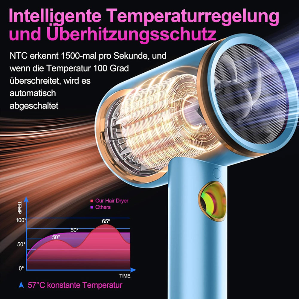 - Dieser Haartrockner verfügt über einen intelligenten konstanten Temperaturschutz, um Ihr Haar zu pflegen. NTC erkennt 1500-mal pro Sekunde, und sobald die Windtemperatur 100° überschreitet, wird der Heizdraht sofort abgeschnitten und behält die