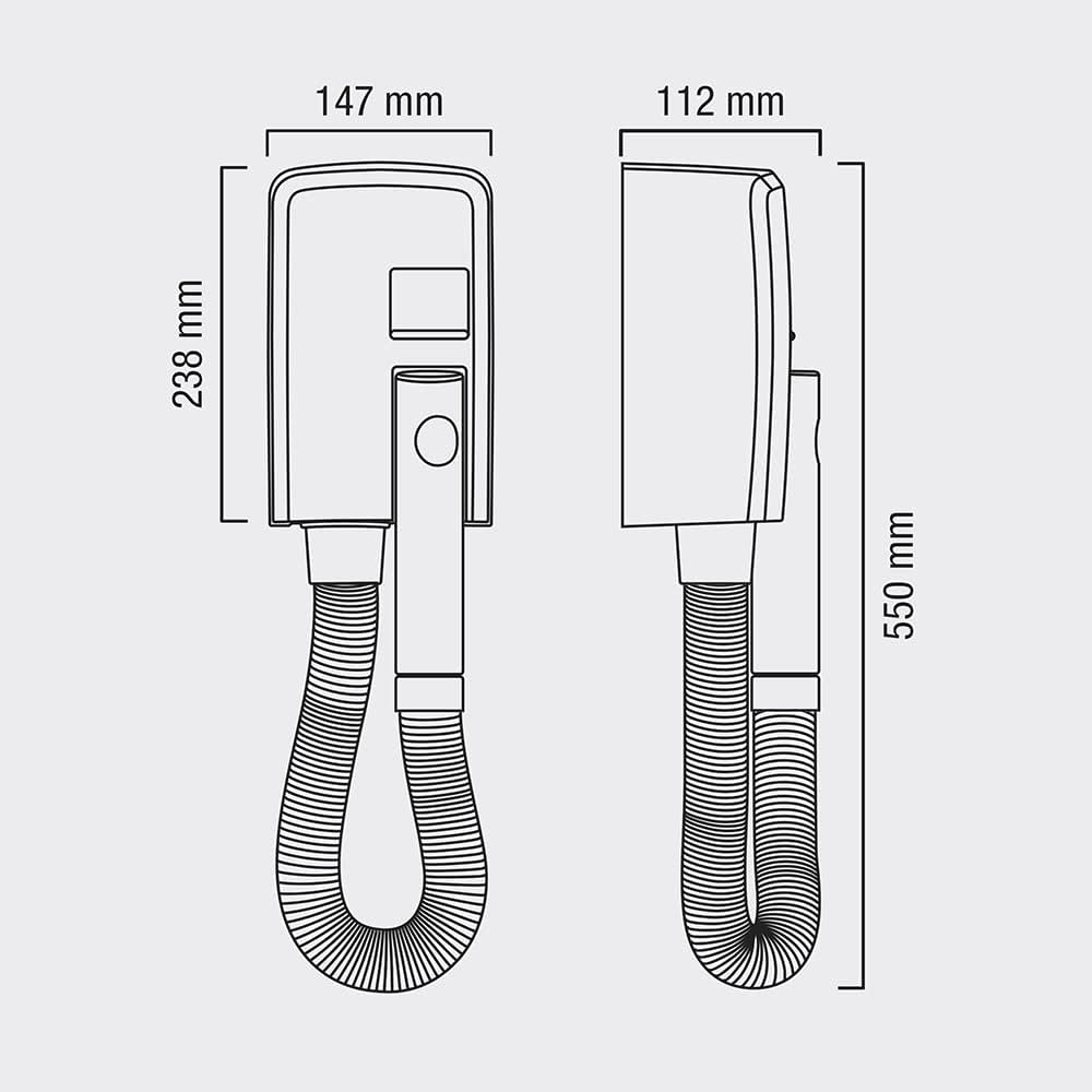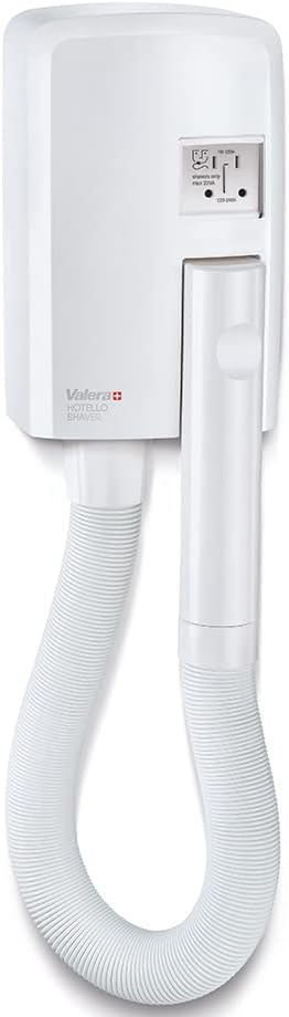- Schlauchhaartrockner zur Wandmontage mit integrierter Steckdose 110-120V/220-240V für Rasierapparate, spritzwassergeschützt mit Schutzgrad IP34