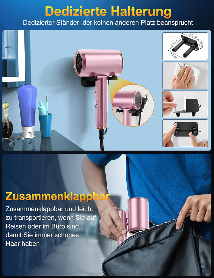 - 【Faltbar, Kompakt und Leicht】Dies ist ein zusammenklappbarer Haartrockner, der Griff kann um 90° gebogen und zusammengeklappt werden.Er ist leicht zu tragen und zu verstauen und nimmt zu hause keinen Platz weg. Der klappbare reisefön mit unserer