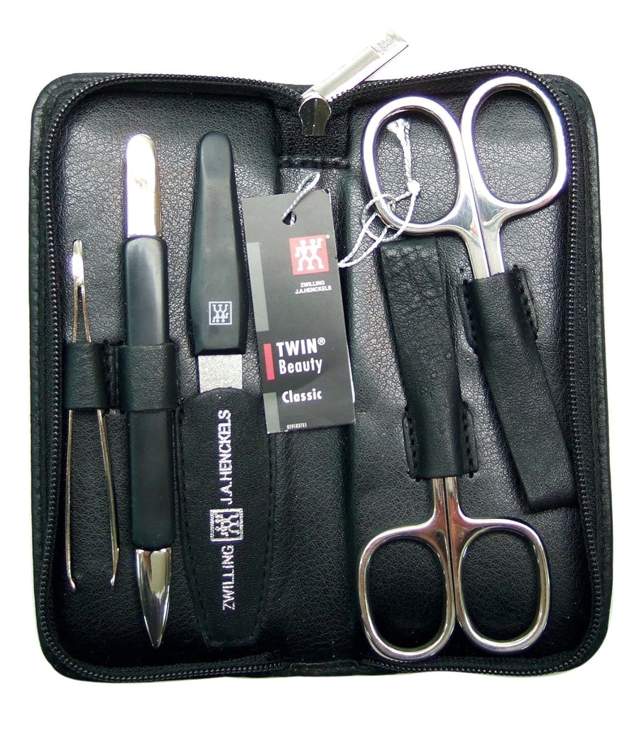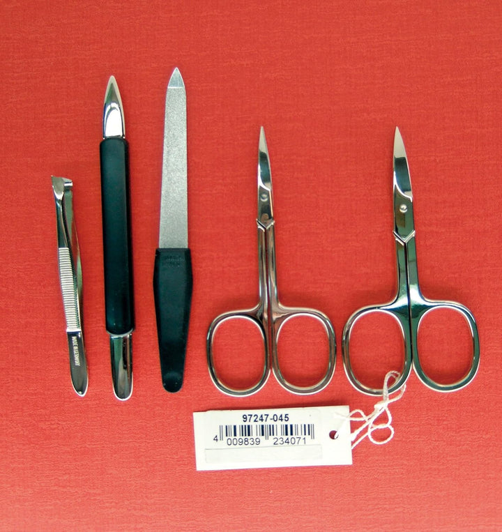 - 1 x Hautschere, 1 x Nagelschere, 1 x Pinzette schräg, 1 x Nagelfeile (schwarz), 1 x Doppelinstrument (schwarz)