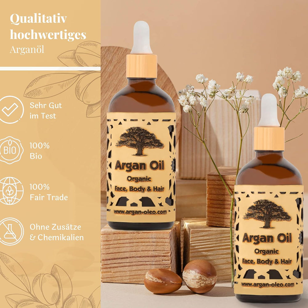 SEHR GUT IM TEST - R&M Beauty-Oleo 2x Bio Argan-Öl aus Marokko - Fair Trade Öl für Haare, Gesicht, N