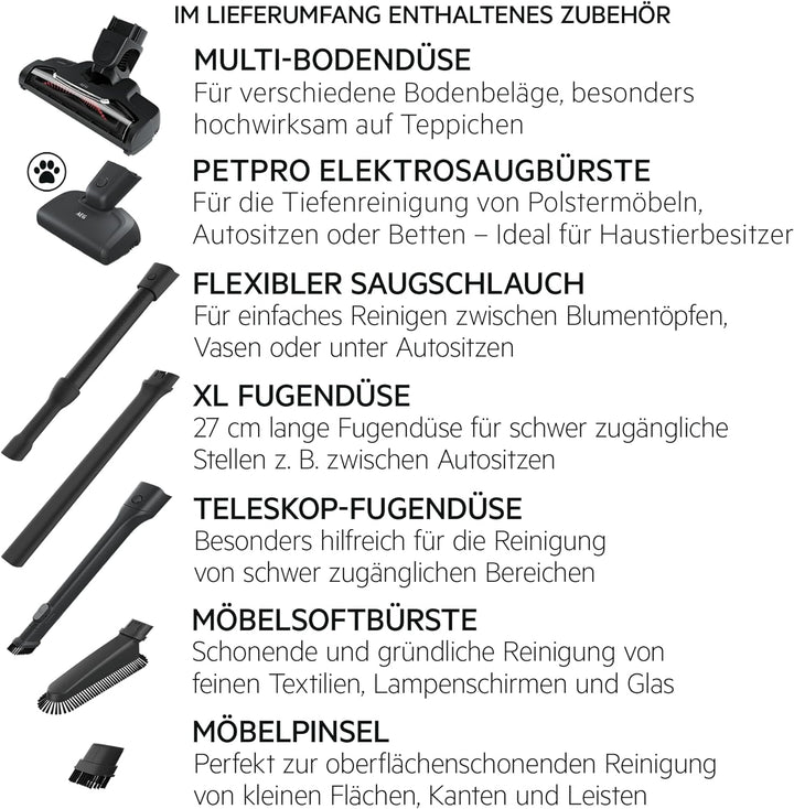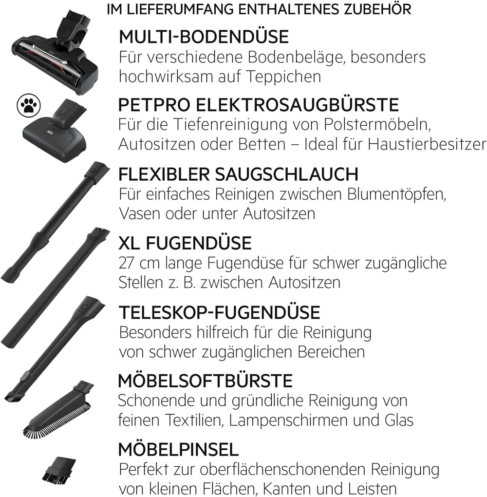 - Lieferumfang: 1x QX7, 1x integrierte Fugendüse und Möbelpinsel, 1x Teleskop-Fugendüse, 1x Flexibler Saugschlauch, 1x Möbelbürste, 1x Ladestation // Zubehör-Empfehlung: Erweiterungsset AKIT21, Power-Softrolle AZE137, Filter-Set ASKW1