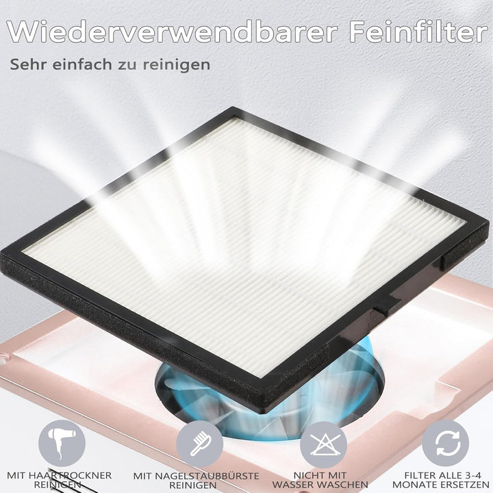 - 【Wiederverwendbarer Filter und Bürste】 Oben am Ventilator befindet sich ein feinmaschiger Filter, der verhindern kann, dass Staub den Ventilator verstopft. Dieses wiederverwendbare Filterpad kann alle Arten von Staub aufnehmen, ohne dass Asche