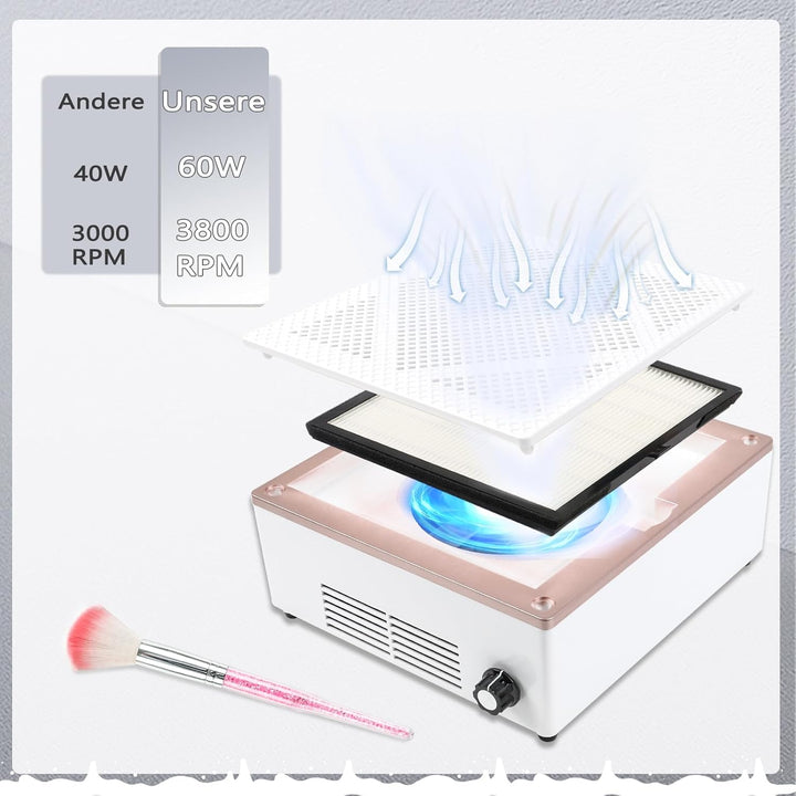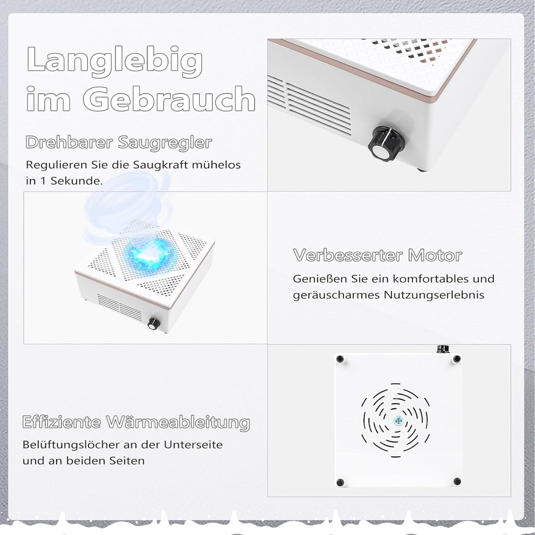 - 【Leistungsstarker und fortschrittlicher Motor】 Der Staubabsaugung für Nägel ist mit einem leistungsstarken Motor ausgestattet und seine Rotationsgeschwindigkeit beträgt bis zu 4500 U/min. Er sammelt leicht Nagelgelstaub, Acrylnagelstaub,