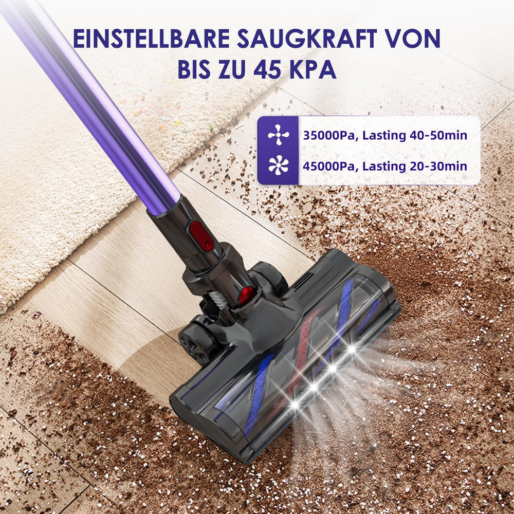 - đă45000Pa starke Saugkraftă Der leistungsstarke Motor des Kabelloser staubsauger liefert einen langanhaltenden, starken Luftstrom mit einer Saugkraft von bis zu 45000pa, der den Staub grĂŒndlich reinigt, ohne RĂŒckstĂ€nde zu hinterlassen.Der Akku