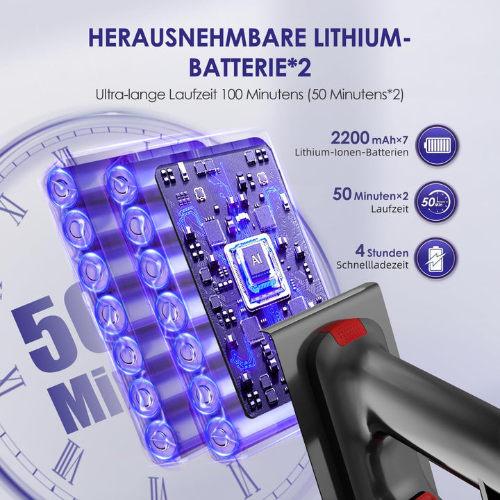 - đă50 Minuten lange Laufzeită Der Staubsauger kabellos verfĂŒgt ĂŒber einen eingebauten 7-Zellen-Akku mit 2200 mAh, der die Lebensdauer verlĂ€ngern und eine herausragende Reinigungsleistung von bis zu 50 Minuten bieten kann.Der Kabelloser