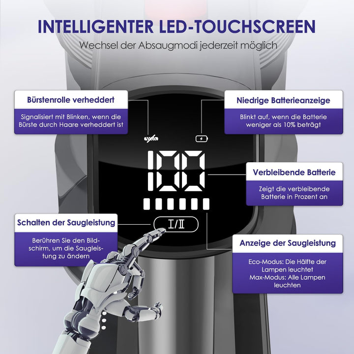 - đăIntelligenter LED-Touchscreenă Der LED-Touchscreen ermöglicht es Ihnen, den Status des kabellosen Staubsaugers in Echtzeit zu ĂŒberwachen. Er zeigt Informationen wie einen niedrigen Akkustand und Warnungen bei verstopften BĂŒrsten an. Die