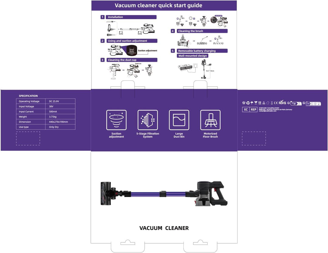- đă5 in 1 hocheffizientes FiltersystemăDer kabellose Staubsauger ist mit einem 5-stufigen Filtersystem ausgestattet, das in mehreren Phasen grosse Partikel, Haare, 2ÎŒm-Partikel und Bakterien filtert, um SekundĂ€rverschmutzung zu vermeiden. Dieses