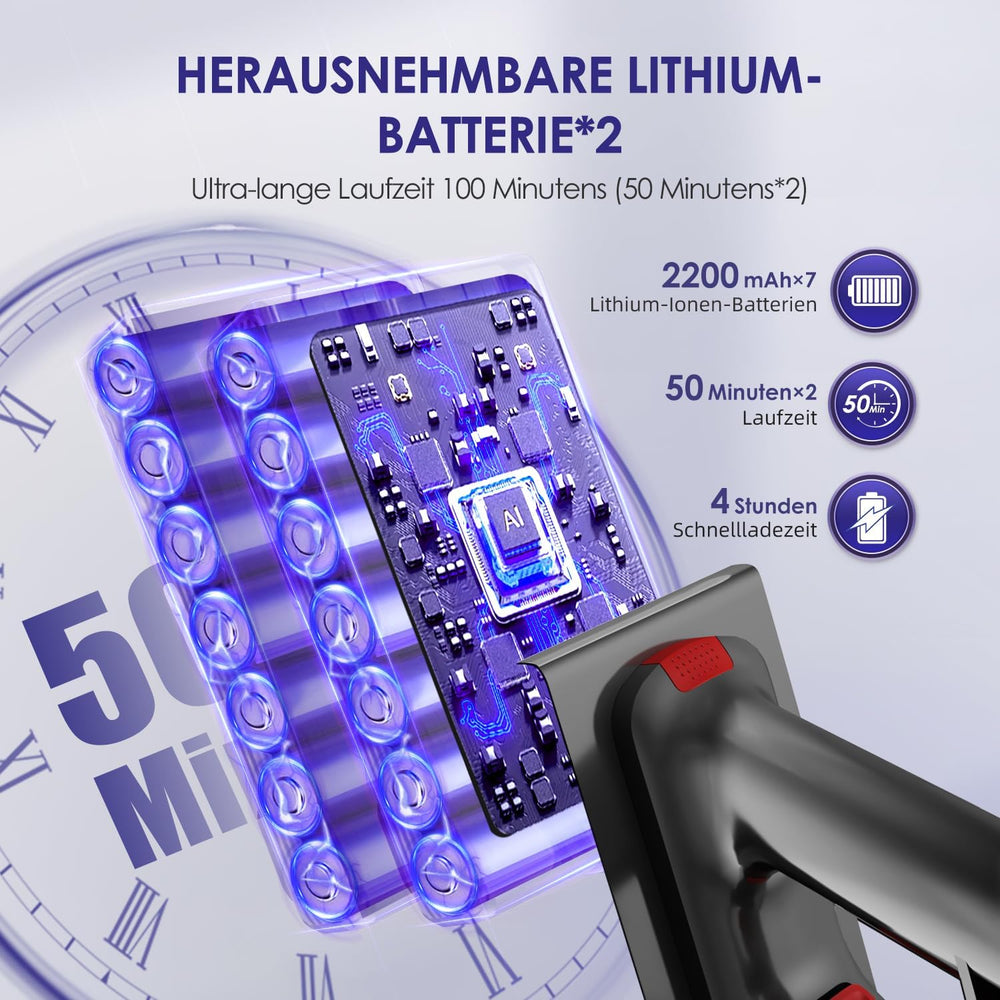 - 【50 Minuten lange Laufzeit】 Der Staubsauger kabellos verfügt über einen eingebauten 7-Zellen-Akku mit 2200 mAh, der die Lebensdauer verlängern und eine herausragende Reinigungsleistung von bis zu 50 Minuten bieten kann.Der Kabelloser Staubsauger
