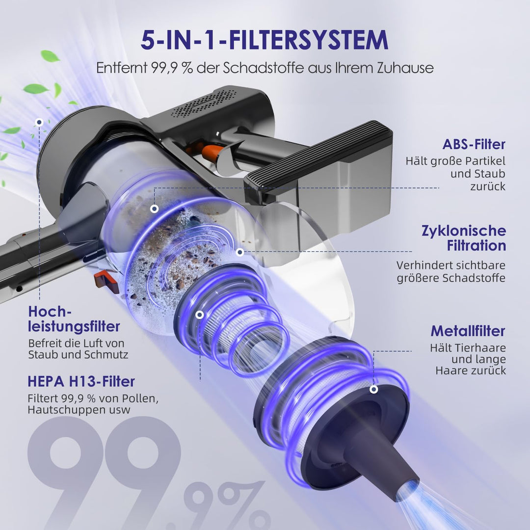 - 【5 in 1 hocheffizientes Filtersystem】Der kabellose Staubsauger ist mit einem 5-stufigen Filtersystem ausgestattet, das in mehreren Phasen grosse Partikel, Haare, 2μm-Partikel und Bakterien filtert, um Sekundärverschmutzung zu vermeiden. Dieses