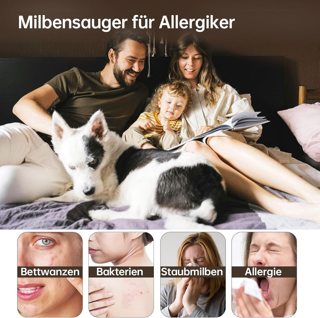 - 3 Modi für eine gründliche Reinigung – Vakuum-Modus, Roll & Beat-Modus und UV-Lampen-Modus. Der Milbenstaubsauger befreit mit seiner 3fachen Wirkungsweise Ihre Matratze von Allergie auslösenden Stoffen wie Milben und Staub. Ideal für Haustierbesitzer, Kinder, alle Hausstaub- und Pollenallergiker.