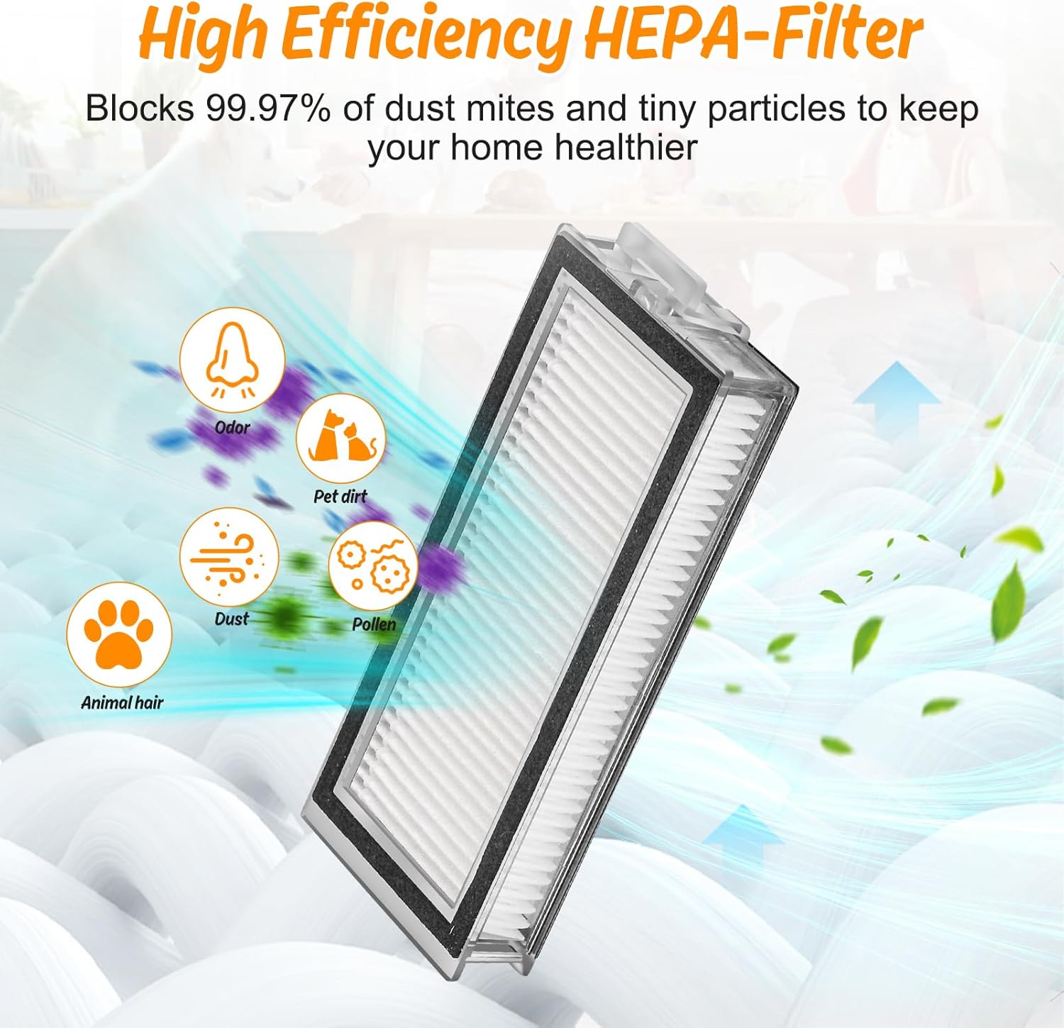 - Luftqualitätsschutz: Die HEPA-Filter fangen feine Partikel bis zu einer Grösse von 0,3 Mikrometern effektiv ab. Der Staubbeutel besteht aus 2 Schichten Vliesstoff und 2 Schichten Schmelzblasenfasern und hilft dabei, die Luft in Ihrem Zuhause sauber und