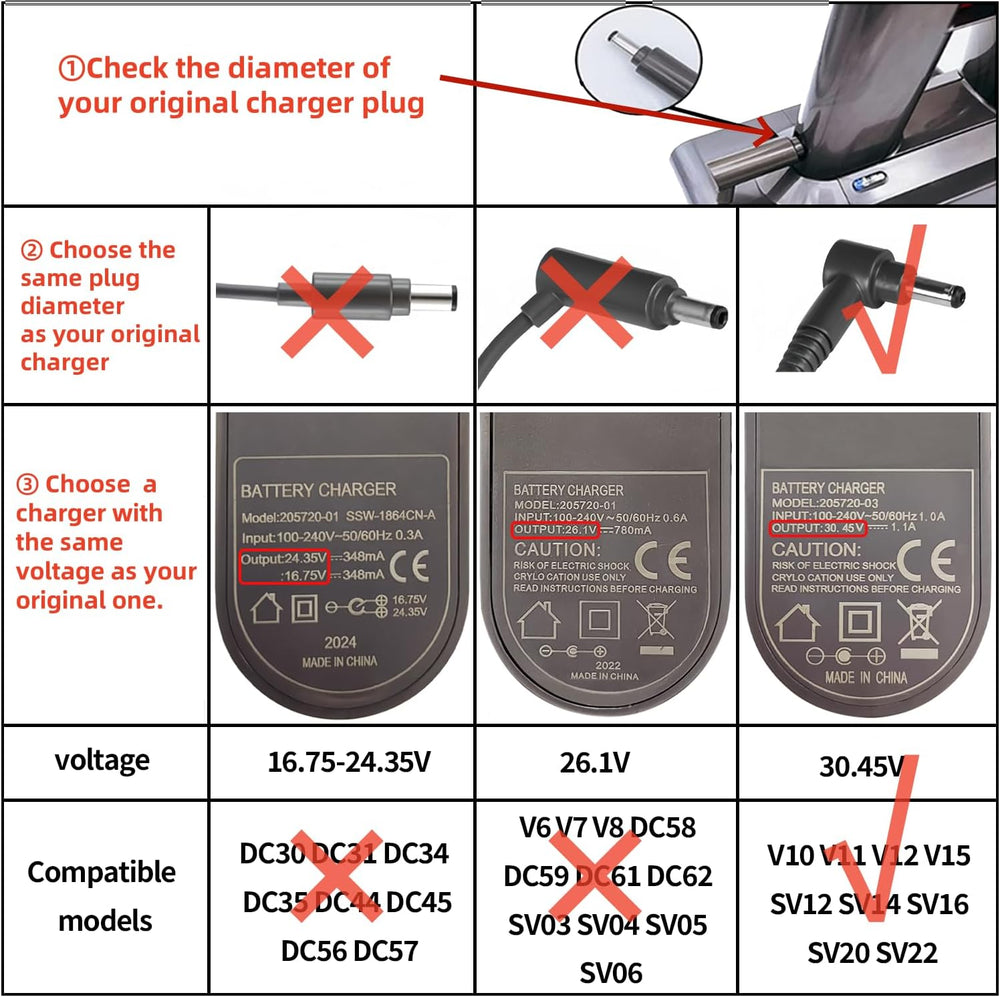 - 1.Ersatz-Ladegerät kompatibel mit Dyson Staubsauger Modell:Für Dyson V10 V11 V15 SV12 SV14 Staubsauger,Unvereinbar mit anderen Modellen. WARME TIPPS: Bitte überprüfen Sie vor dem Kauf Ihr Staubsaugermodell, die Form des Steckers und den