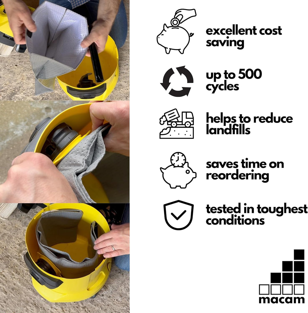 - Die Garantie von Macam gilt für das Aufsaugen von trockenem Schmutz, Holzspänen, Sägemehl und allgemeinem Schutt. Bitte beachten Sie, dass sich die Lebensdauer des Macam-Filterbeutels erheblich verkürzen kann, wenn Sie ihn hauptsächlich für Beton,