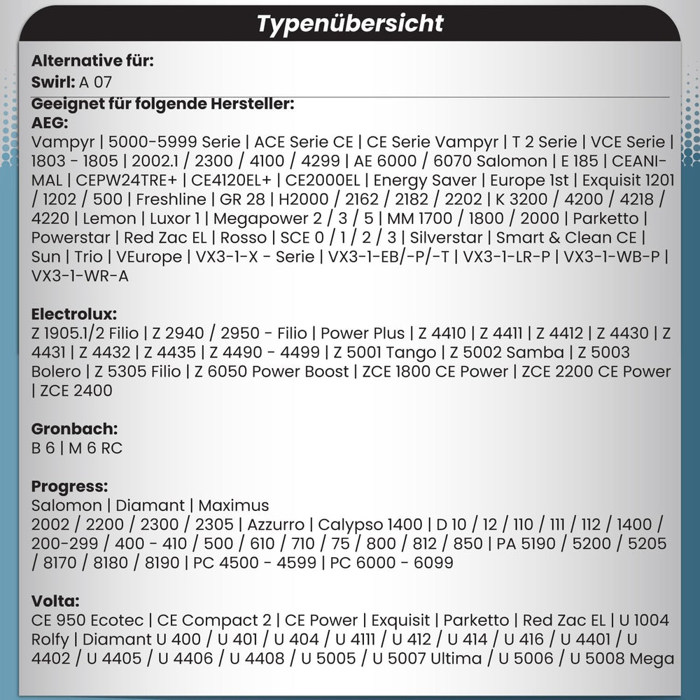 - ✅ KOMPATIBEL - mit AEG Vampyr, CE, Exquisit, Electrolux, Privileg, Profissimo, Progress, Quigg, Satrap, Vivess, Variant, Wolf, als Alternative für Swirl A 07