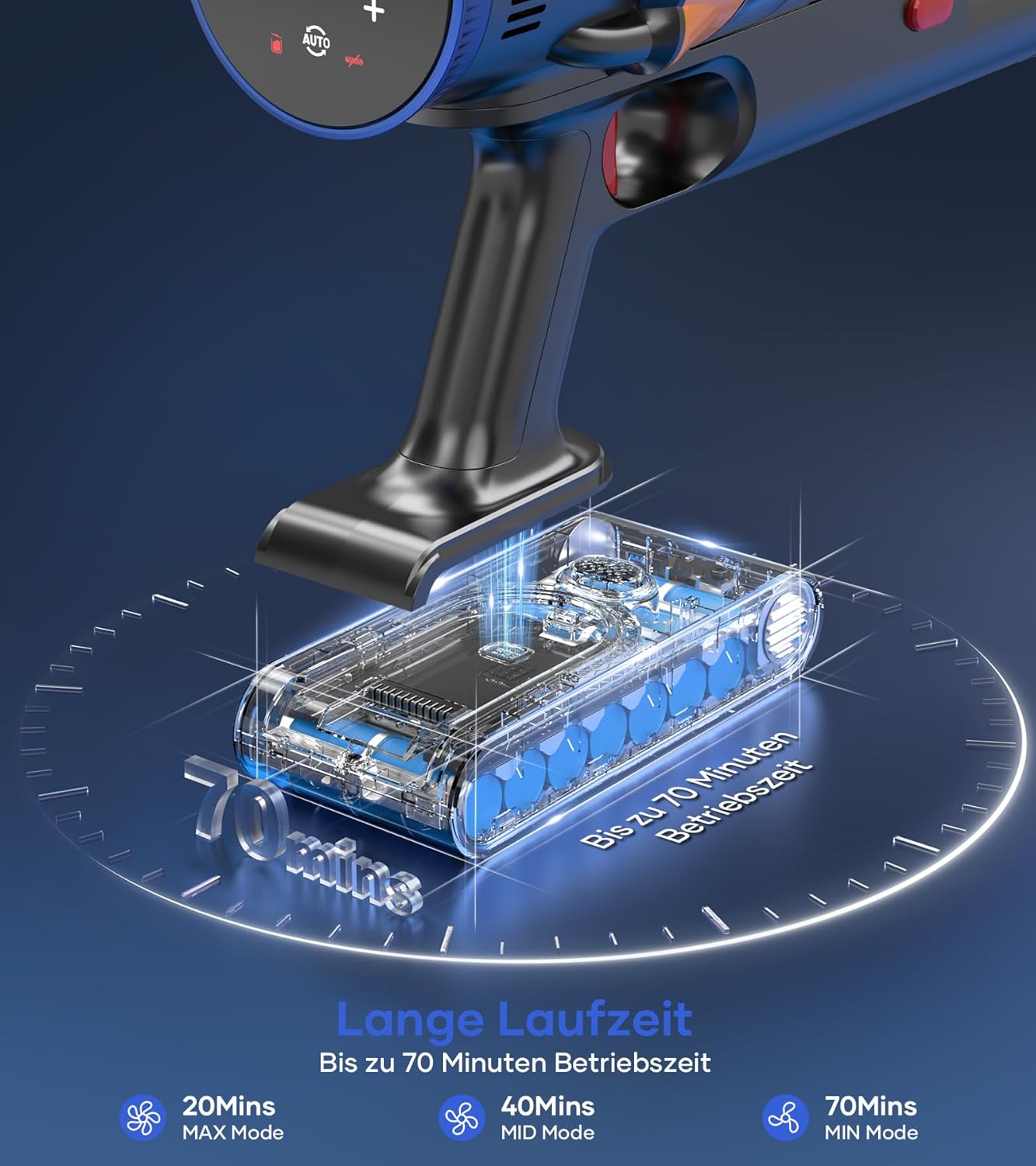 - 【70 Minuten Lange Laufzeit】 Der Staubsauger ist mit einem grossen, abnehmbaren 8x2500mAh-Akku ausgestattet, wodurch sich die Reinigungszeit unseres kabelloser Staubsauger um 35 % verlängert. Das Reinigen der gesamten Wohnfläche in einem Ladezyklus