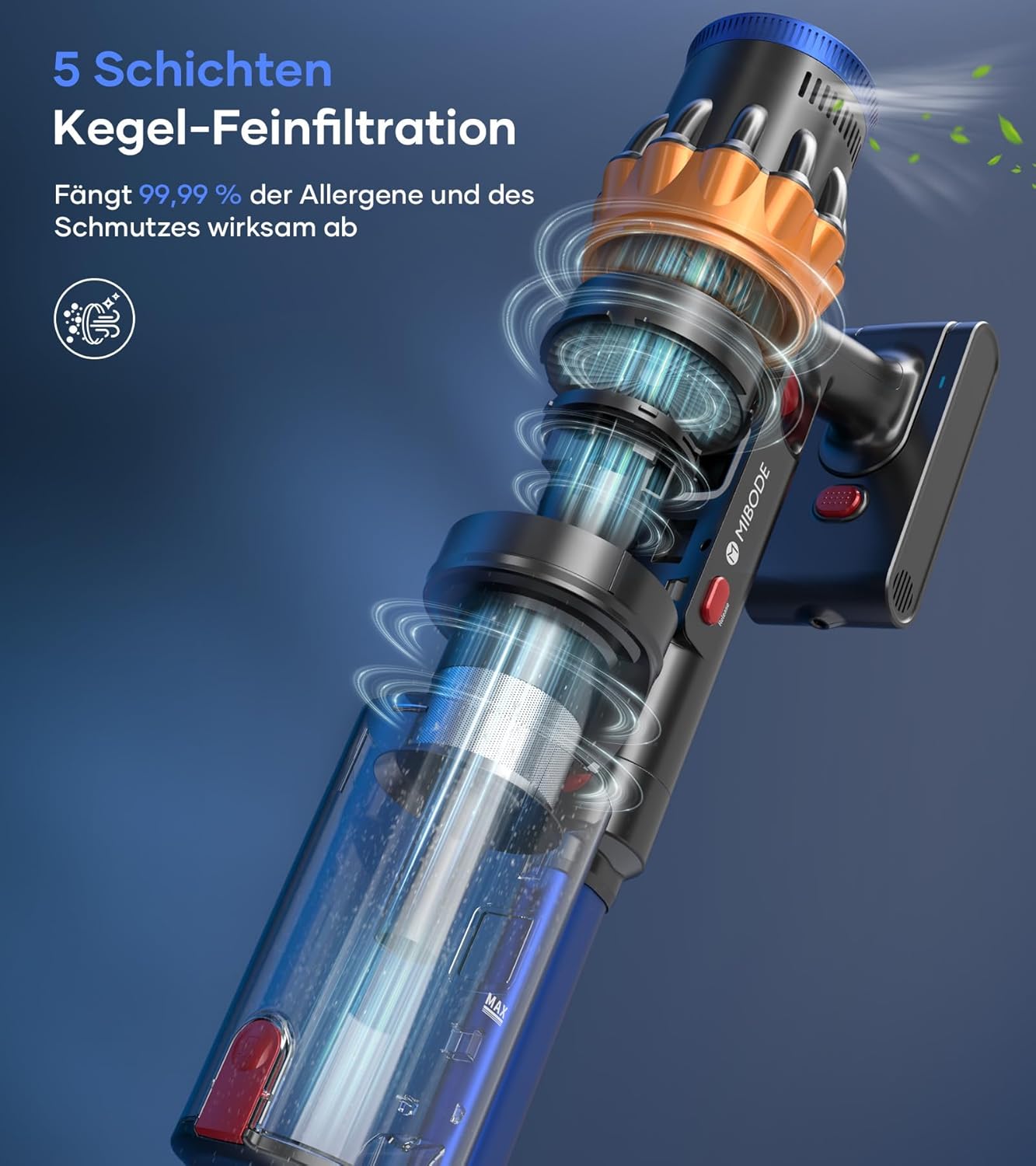 - 【99,99% Effiziente Filtration + 1,5L Grosser Staubbehälter】 Der akku Staubsauger tierhaare ist mit einer Doppelzyklon-Struktur ausgestattet, die eine effektive Filtration gewährleistet. Das 5-lagige Filtersystem entfernt 99,99% der winzigen