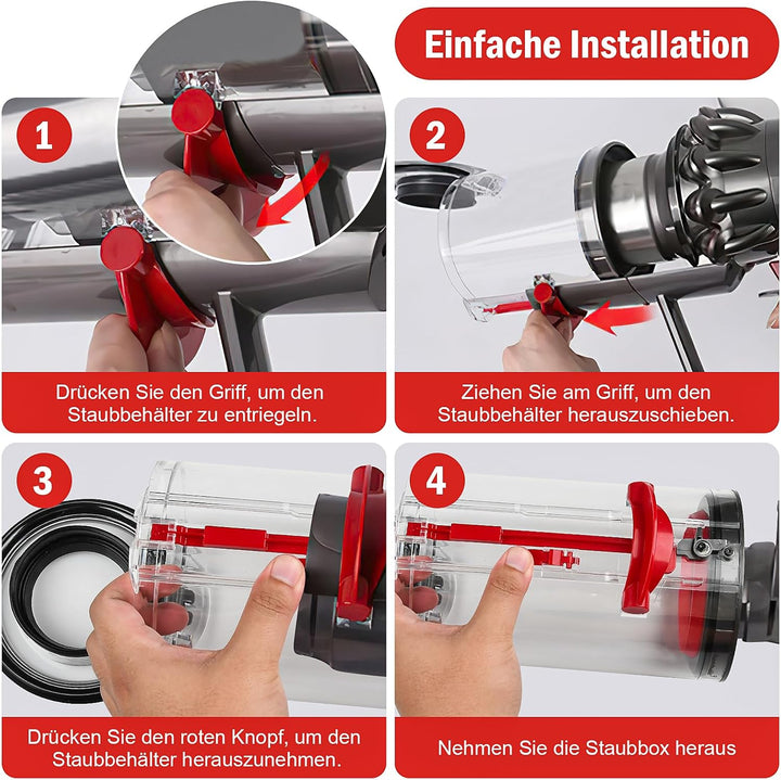 - 🔧【Einfache Installation】Ziehen Sie zuerst am roten Griff, um den Staubbehälter zu entriegeln, drücken Sie den roten Knopf, um den Behälter auszuwerfen, und nehmen Sie schliesslich den Staubbehälter heraus, Installation kann ohne Werkzeug