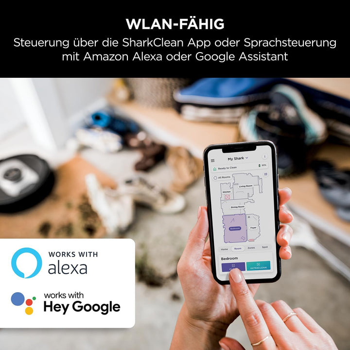 - GEZIELTE REINIGUNG: Zielen Sie auf stark benutzte Bereiche und einzelne Räume mit dem Ultra Clean Modus ab, indem Sie die SharkClean App verwenden. Planen Sie eine Komplettreinigung des gesamten Hauses. Steuern Sie die Reinigung per Sprachbefehl mit