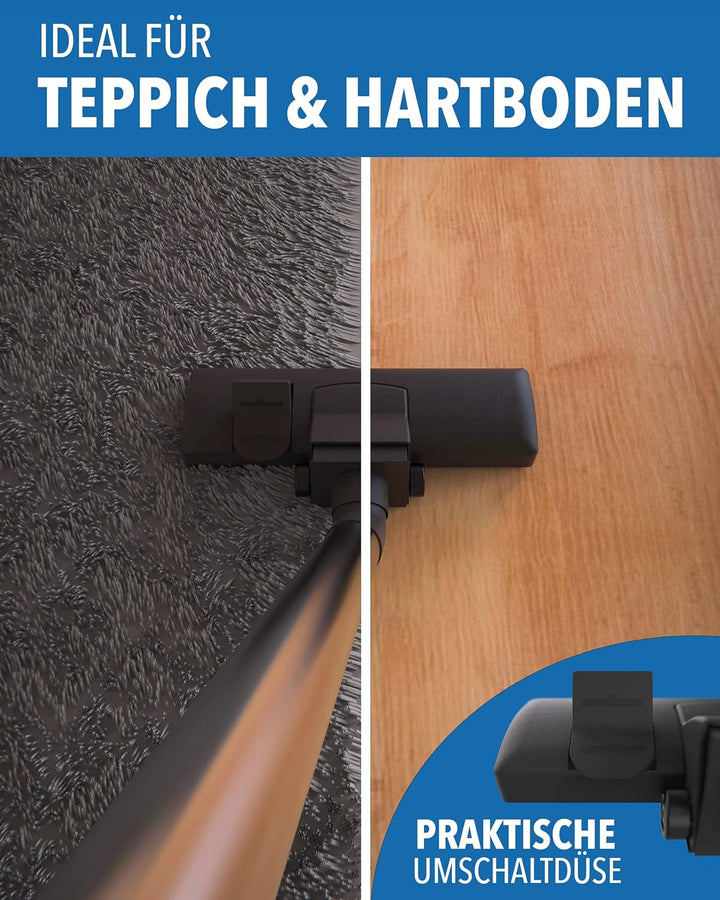 - โ ๐๐๐๐๐๐๐ & ๐๐๐๐๐๐๐๐๐ - Der Kippschalter ermรถglicht flexibles Wechseln zwischen beiden Bodenarten. Durch das eingebaute Drehgelenk ist der Staubsaugerkopf sehr beweglich.