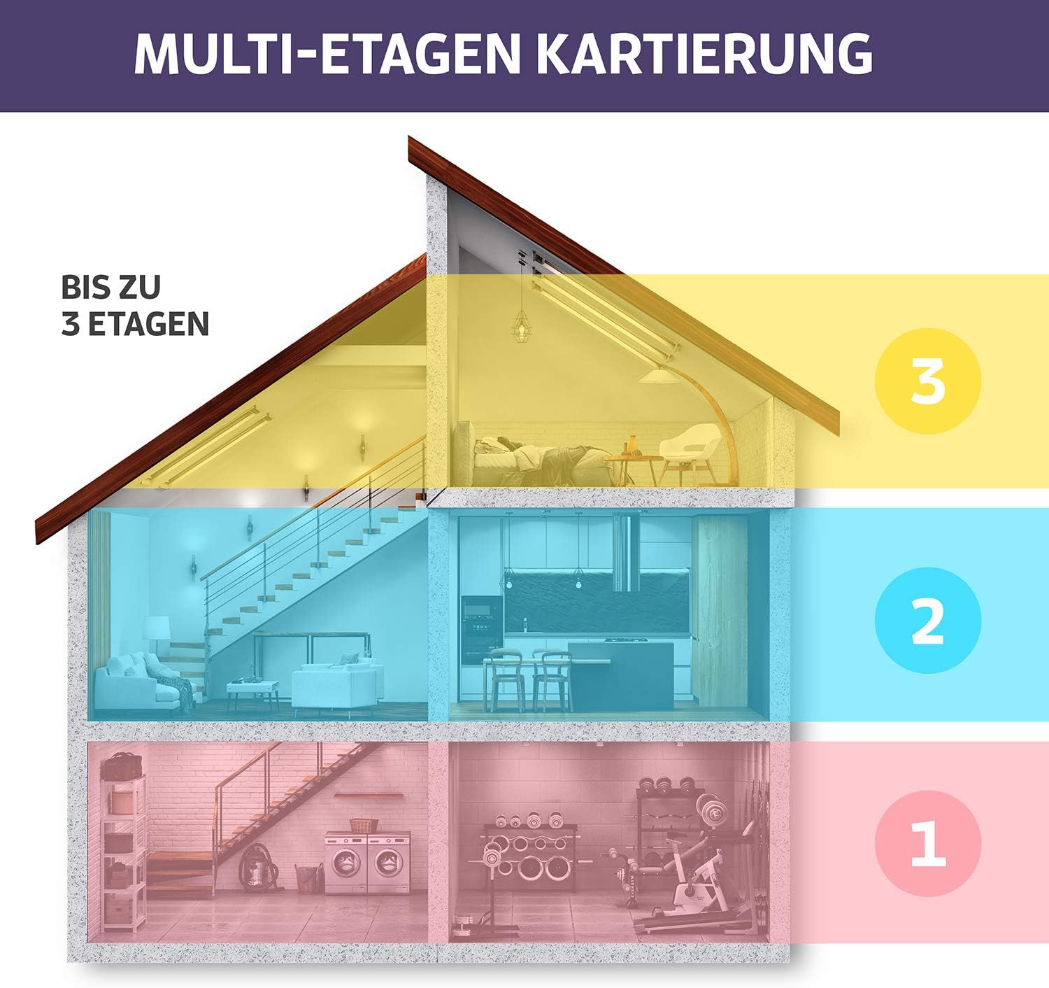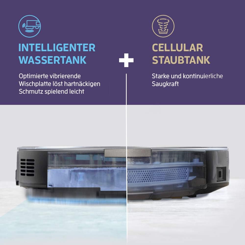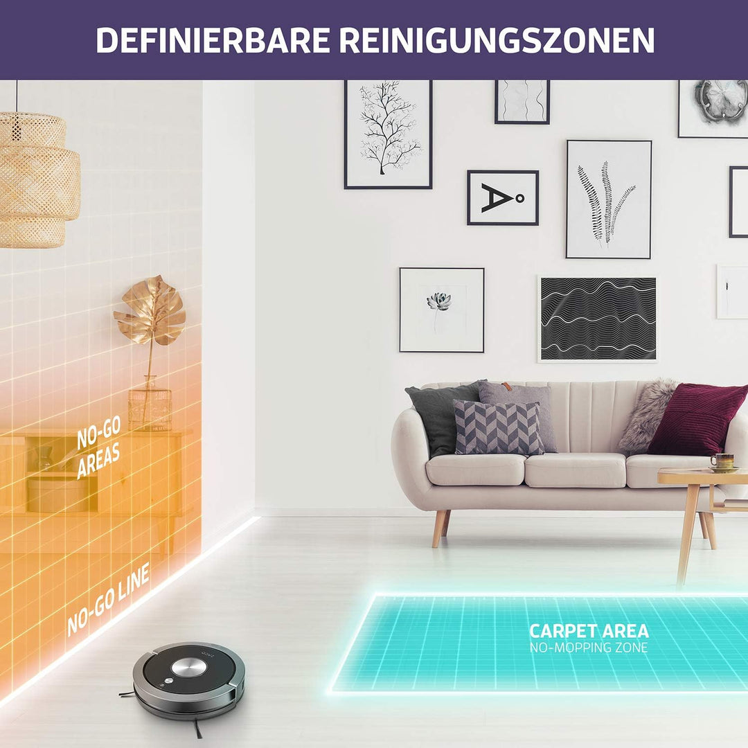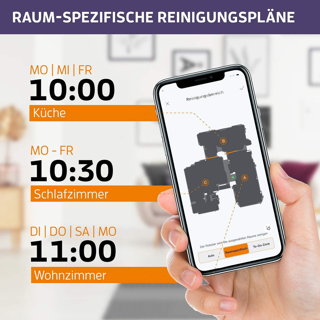 - App & Alexa Steuerung: Smart Mapping speichert Raumkarten in bis zu 3 Etagen, No Go Zonen, Teppich Zonen (kein Wischen, mehr Saugstärke), Sprachsteuerung mit Alexa & Google Home sowie OTA fähig (automatische Updates)