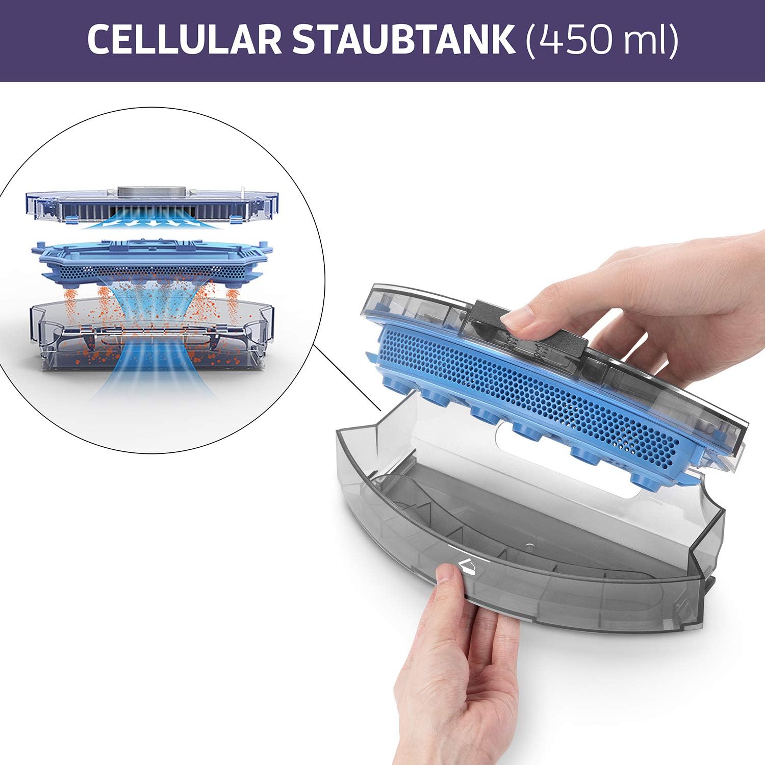 - Cellular Staubtank: Spezielles Design verhindert, dass Haare oder Schmutz im Tank haften bleiben. Dies gewährleistet jederzeit eine optimale Saugleistung und reduziert die Häufigkeit des Filterwechsels