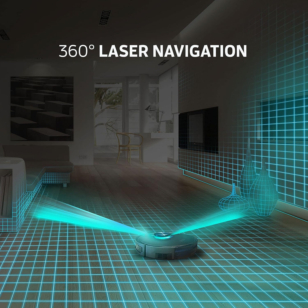 - 360° Laser Navigation: Präzise Navigation und Hindernisvermeidung, wodurch Möbel und Einrichtungsgegenstände geschützt werden. Der Reinigungsfortschritt kann in Echtzeit verfolgt und angepasst werden.