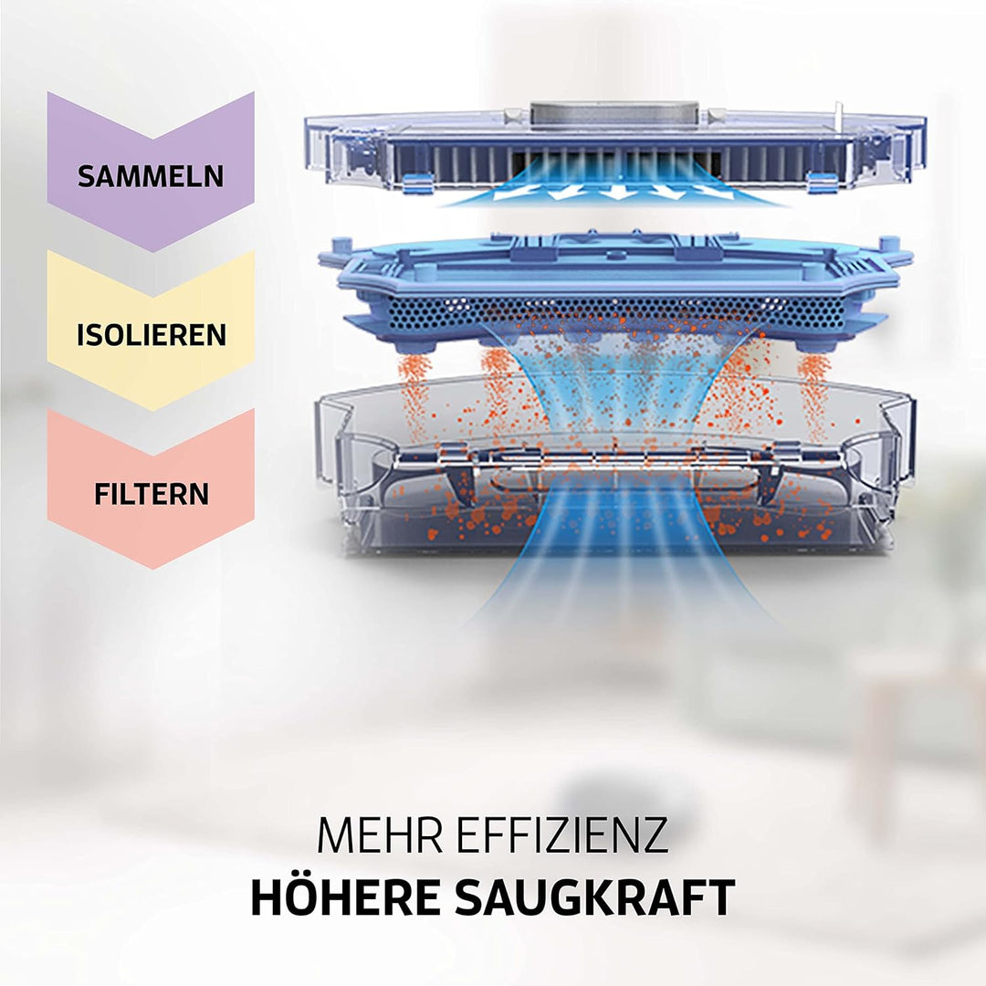 - Smartphone App: Präzise Raum Kartierung & Multi Mapping (bis zu 3 Etagen), raumspezifische Reinigungspläne, benutzerdefinierte No Go, To Go und Teppich Zonen sowie Saugkraft-, Wasserstufen- und Seitenbürstenregulierung.