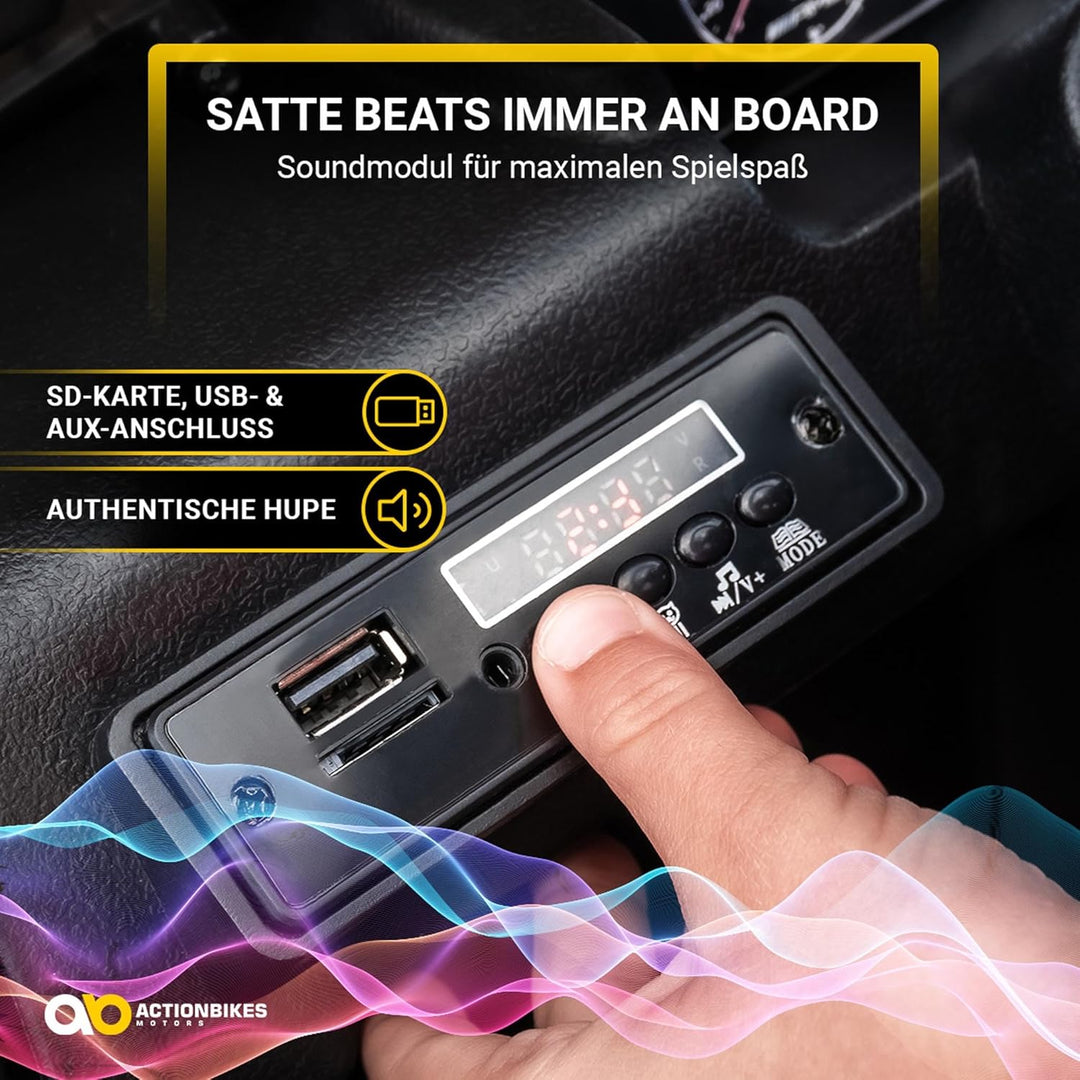 - ✔ Multimedia ✔ Multifunktionslenkrad verstellbar ✔ Soundmodul am Lenkrad ► USB- & AUX-Anschluss ► SD-Karte ✔ Hupe am Lenker ✔ Motorsound beim Start ✔ Transportbügel