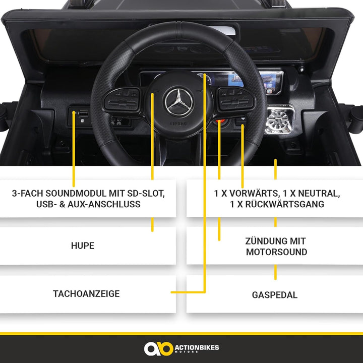 - ✔ Original Actionbikes Motors Mercedes Lizenz ✔ 2-Rad Antrieb ✔ 2 x 35 Watt Motor ( Total 70 Watt ) ✔ Ausdauernde 12 Volt 4,5 AH Batterie ✔ Bis zu 6 km/h ✔ Mädchen & Jungen
