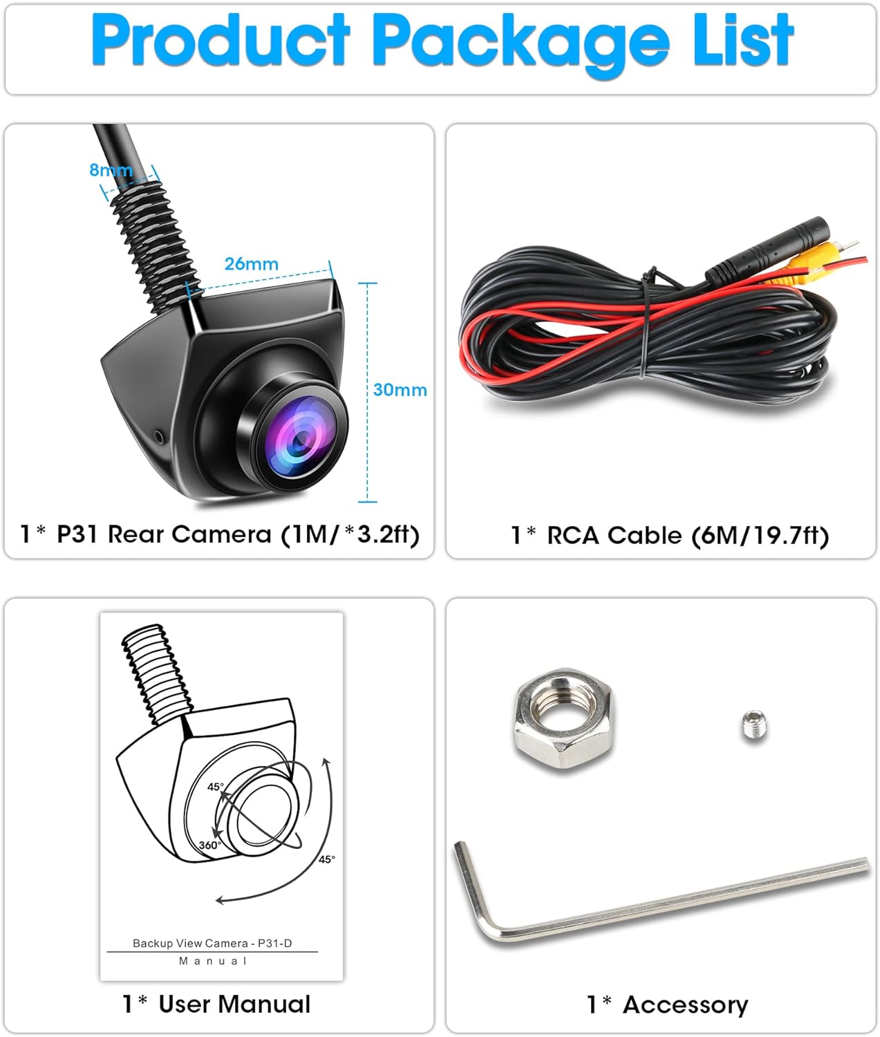 - 360° Drehbarem Objektiv Rückfahrkamera: Rückfahrkamera mit kabel verfügt über ein um 360° drehbares Objektiv, unterstützt Einstellung nach auf und ab, links und rechts 45°, flexible Installation ermöglicht, eingeschränktes Sichtfeld vermeidet.