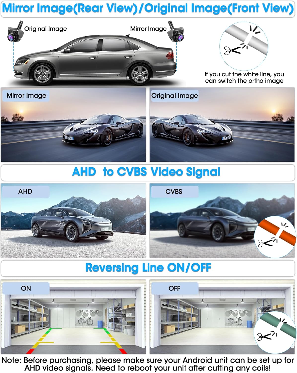 - Drei Steuerungsmodi: Rückkamera Standardeinstellung ist AHD 1080P(25 fps), Sie können leicht klare Bilder auf Filmebene geniessen. Auto-rückfahrkamera unterstützt den AHD und HD Schalter. Wenn Ihr Gerät AHD nicht unterstützt, schneiden Sie bitte