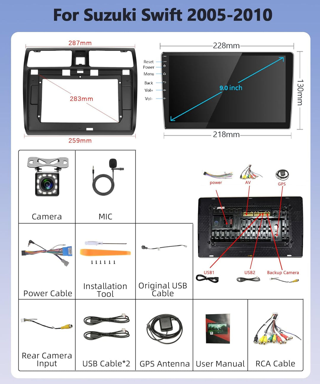 - 1️⃣【10.1 Zoll Touchscreen Android Autoradio 2 Din für Suzuki Swift】Kompatible Fahrzeuge: Suzuki Swift 2003-2010. 10.1 Zoll 2,5 D Autoradio Player aus gehärtetem Glas. RAM 1G + ROM 16G Speicher, 2 USB Adaptereingang. Unterstützung für externes