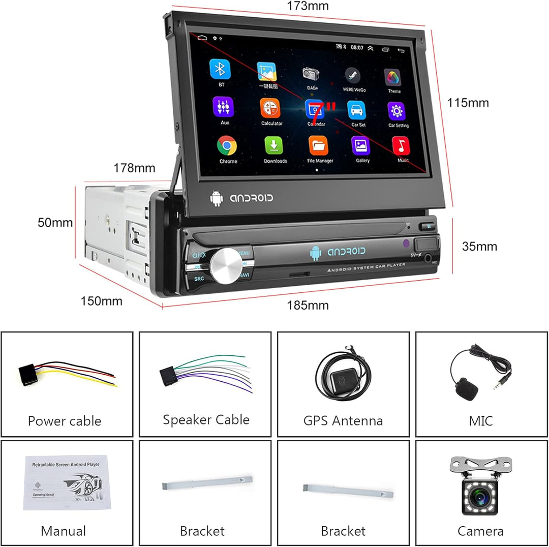 - 【Android Auto Multimedia Player】 Dies ist ein 1-Din-Android 10.0-Autoradio mit 7-Zoll-HD-1080P-Bildschirm, intelligenter Navigation und faltbarem kapazitivem Touchscreen. Die Bildschirmauflösung beträgt 1024 * 600. Das Autoradio unterstützt WIFI, GPS-Navigation, Bluetooth, FM-Radio, Phone Mirror Link, Lenkradsteuerung, 1G RAM / 16G ROM, mit einer 12-LED-Rückfahrkamera und einem Mikrofon. Installationsgrösse: 188*50mm