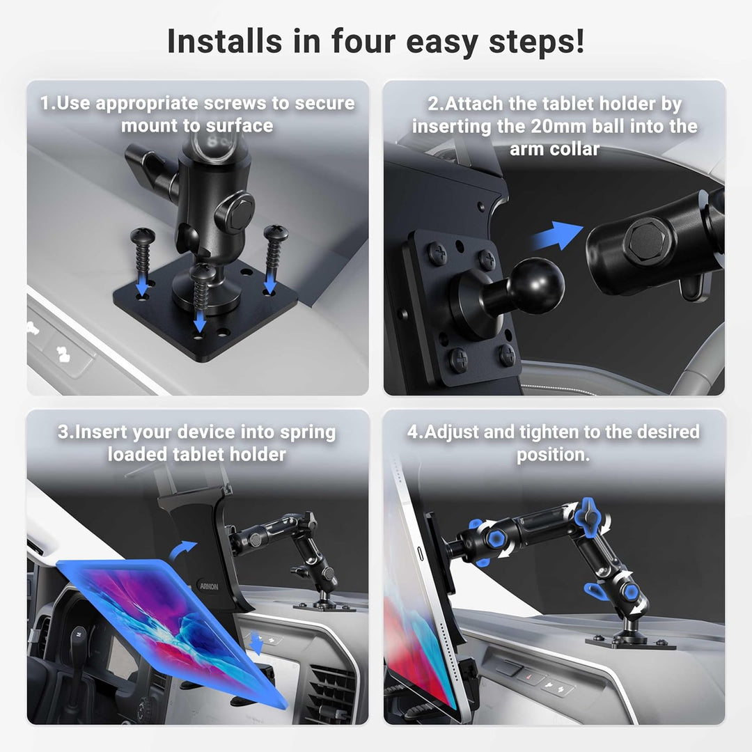 - Strapazierfähige Zuverlässigkeit: Diese Tablet-Halterung verwendet eine 4-Loch-Bohrhalterung, sodass Sie sie überall dort installieren können, wo Sie sie brauchen. Legen Sie es auf jedes Auto, LKW oder Fahrzeug-Armaturenbrett oder Konsole, es ist