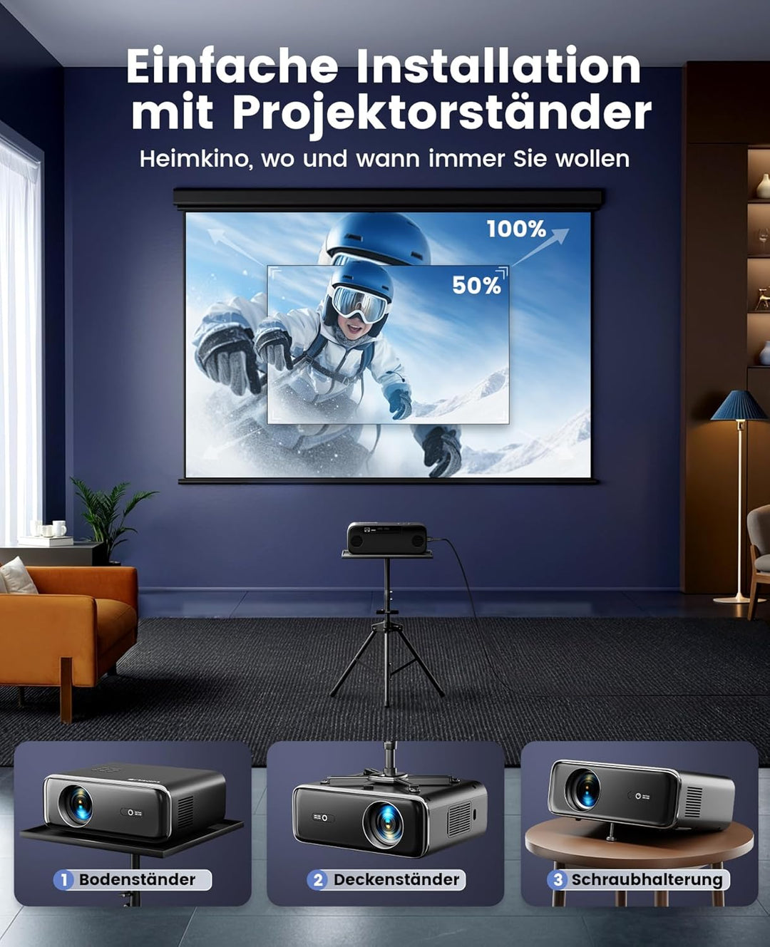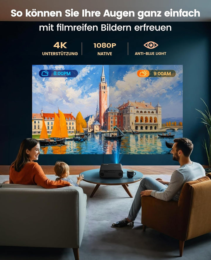 - 🛒【4P/4D Keystone & 300" grosser Bildschirm】Wimius Heimkino beamer ist nicht nur mit einer horizontalen und vertikalen 4D-Korrektur ausgestattet, sondern übernimmt auch eine erweiterte 4 Punkt Trapezkorrektur, sodass der Beamer überall aufgestellt werden kann. Der Beamer full hd unterstützt Front/Side/ Deckenprojektion. Geniessen Sie jederzeit die 300" grosse Leinwand, und 50 % Zoom ermöglicht es Ihnen, das Bild auf eine angenehme Grösse einzustellen, ohne den Beamer zu bewegen.
