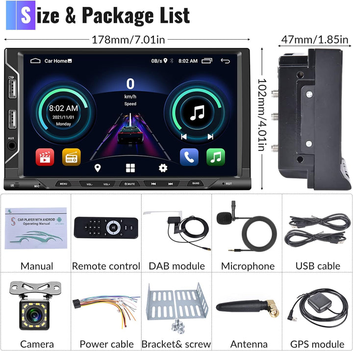 - 【Hardware und Android-Autoradiosystem】Die Funktion von Android doppel-din Autoradio: Quad Core+Android 11+(1G+16G)+1080P kapazitiver Touchscreen(1024*600p)+ mit Apple Carplay +Android Auto+DAB+FM/ RDS + WiFi + BT + Auto-GPS-Navigation + 2-Din-Autoradio mit Rückfahrkamera + Mikrofon. Mit dem Multimedia-Player des Autoradio-Touchscreen-Radios können Sie jede Anwendung wie YouTube, Spotify usw. verwenden. Installationsgrösse: 178 * 100 mm