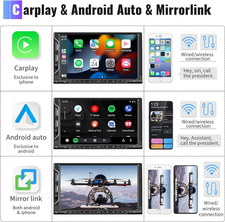 - 【CarPlay, Android Auto und MirrorLink】 Autoradio mit Wireless Carplay, Wired CarPlay und Android Auto. Machen Sie Anrufe, senden/empfangen Sie Nachrichten, hören Sie Musik usw., während Sie sich auf das Fahren konzentrieren. Apps, die nicht von CarPlay oder Android Auto unterstützt werden, können mit MirrorLink auf dem Radiobildschirm angezeigt werden
