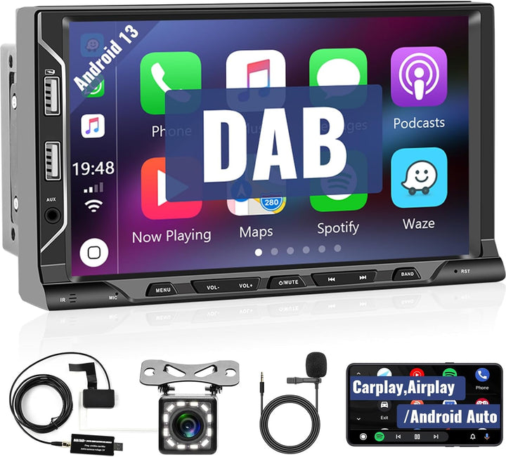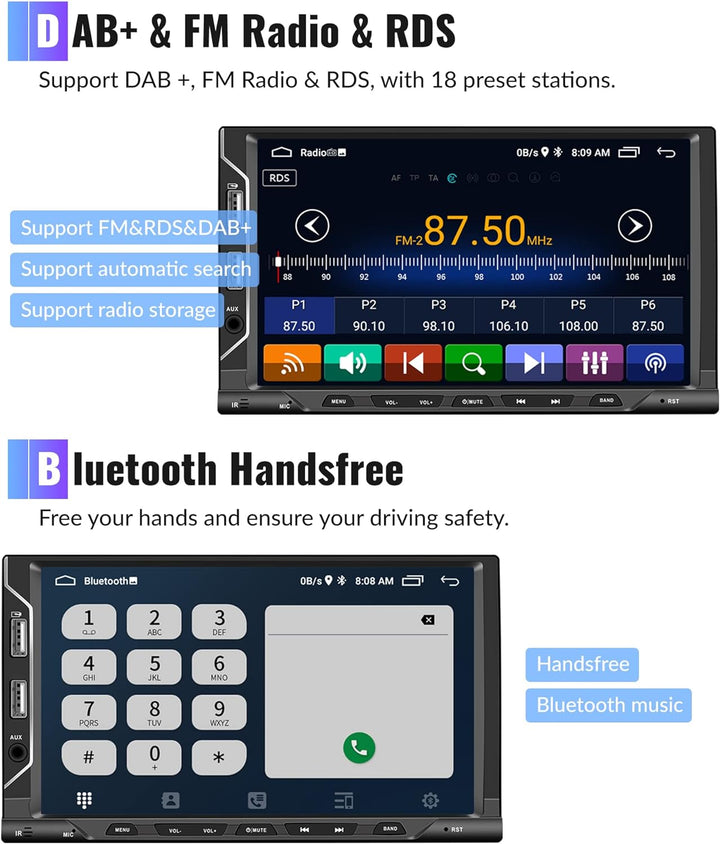- 【Bluetooth und DAB+-Empfänger/FM/RDS-Radio】 Autoradio mit integriertem Bluetooth und Mikrofon für Freisprechanrufe, Unterstützung für das automatische Laden von Telefonbüchern, Anzeigen von Anrufprotokollen und BT-Musikwiedergabe. Integrierter DAB+ Empfänger und Hochleistungstuner für UKW; unterbrechungsfreies Umschalten zwischen DAB und UKW; Equalizer-Einstellungen für verschiedene Soundeffekte und Musikstile; DAB+ Antenne inklusive