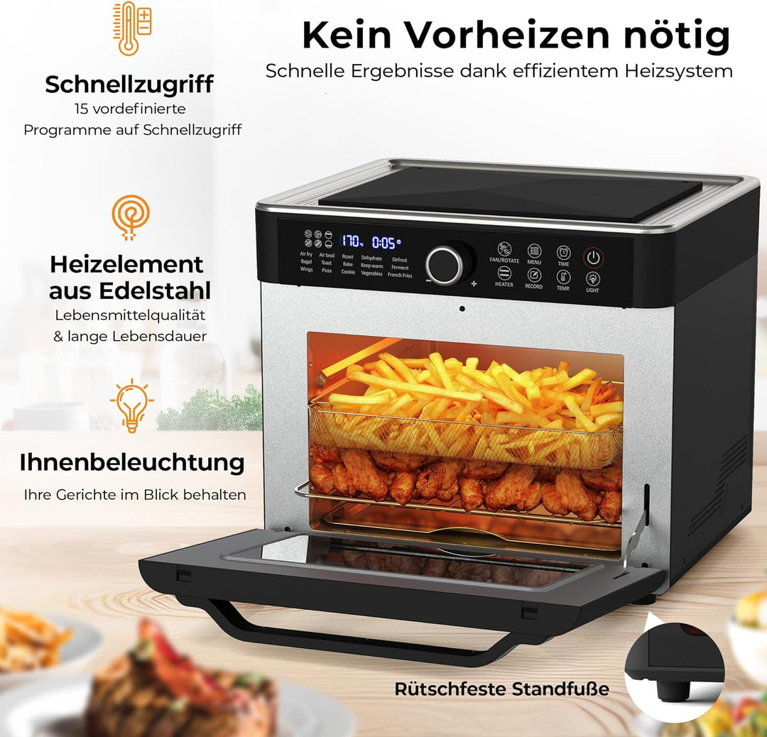 - 360° LUFTZIRKULATION, 22L VOLUMEN - Perfektionieren Sie Ihre Gerichte mit gleichmässiger und knuspriger Bräune dank der professionellen Heizelemente und Lüfter. Der Mini Backofen ist dank mehrerer Ebenen ideal für die Zubereitung mehrerer Gerichte