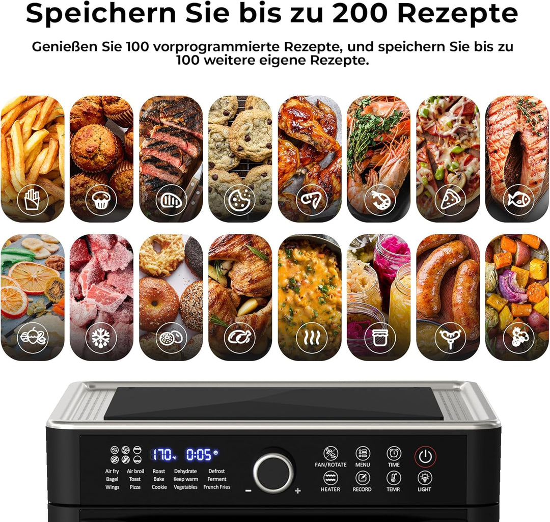 - BIS 200 REZEPTE UND 15 PROGRAMME - Kochen war noch nie so einfach! Profitieren Sie von 100 in der Heissluftfritteuse gespeicherten Rezepten und 15 Schnell Programmen. Ein gedrucktes Kochbuch liegt bei, die vorprogrammierte Rezepte sind jederzeit über