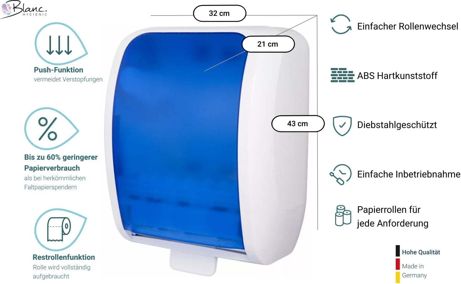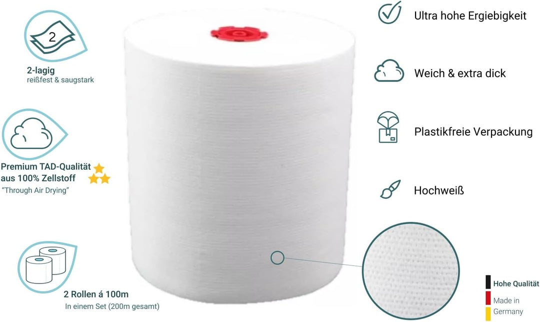 - Komplettpaket: Dieses exklusive Set enthält 1 x Papiertuchspender + 2 x Handtuchrollen & 1x Seifenspender zur Wandbefestigung + 2x 1 L Kartusche milde Seife. Made in Germany.