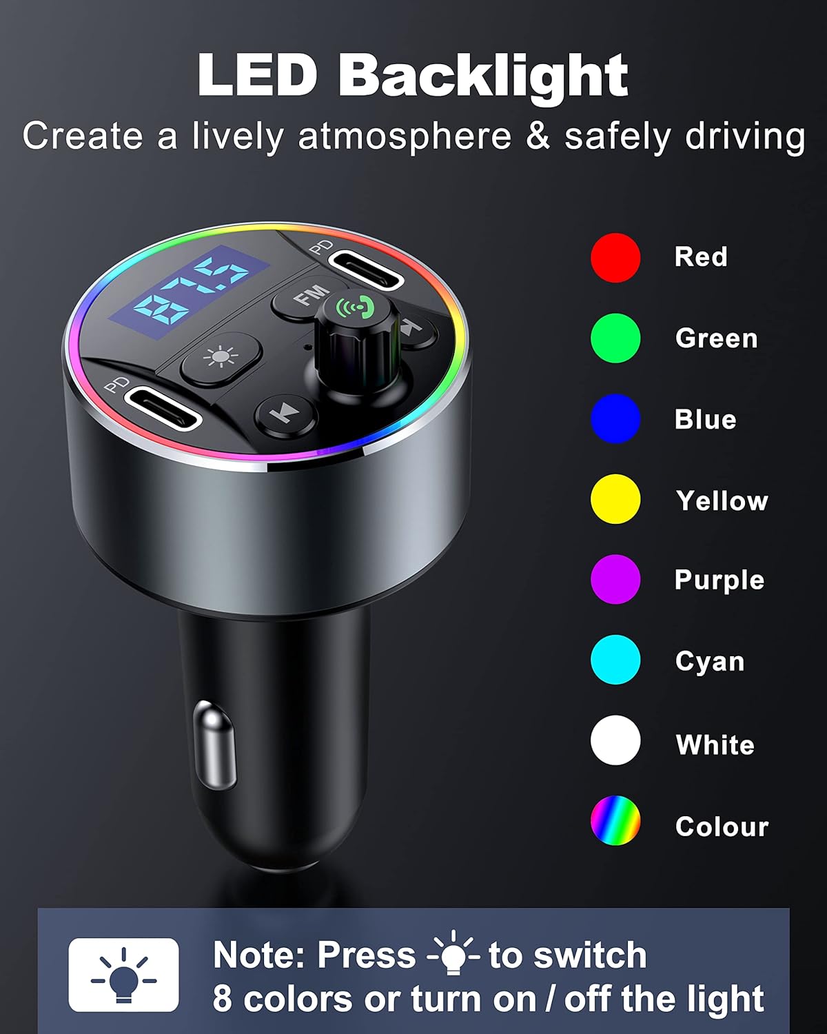 - [Farbiges LED-Licht des bluetooth adapter für das auto 】Guanda Transmitter für auto verfügt über 9 farbige Atmosphärenlichter, Macht mehr Spass beim Fahren. Es gibt eine Taste, die das Licht ausschaltet. Alles bis zu Ihrer Wahl
