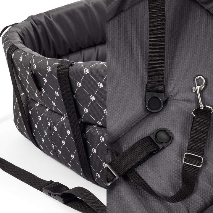 - 💺 SICHERES REISEN: Einfache und schnelle Montage auf dem Beifahrer- oder Rücksitz mit dem Sicherheitsgurt des Autos und einem verstellbaren Gurt um die Kopfstütze des Autositzes. Im Inneren befindet sich eine Leine (mit Karabinerhaken).