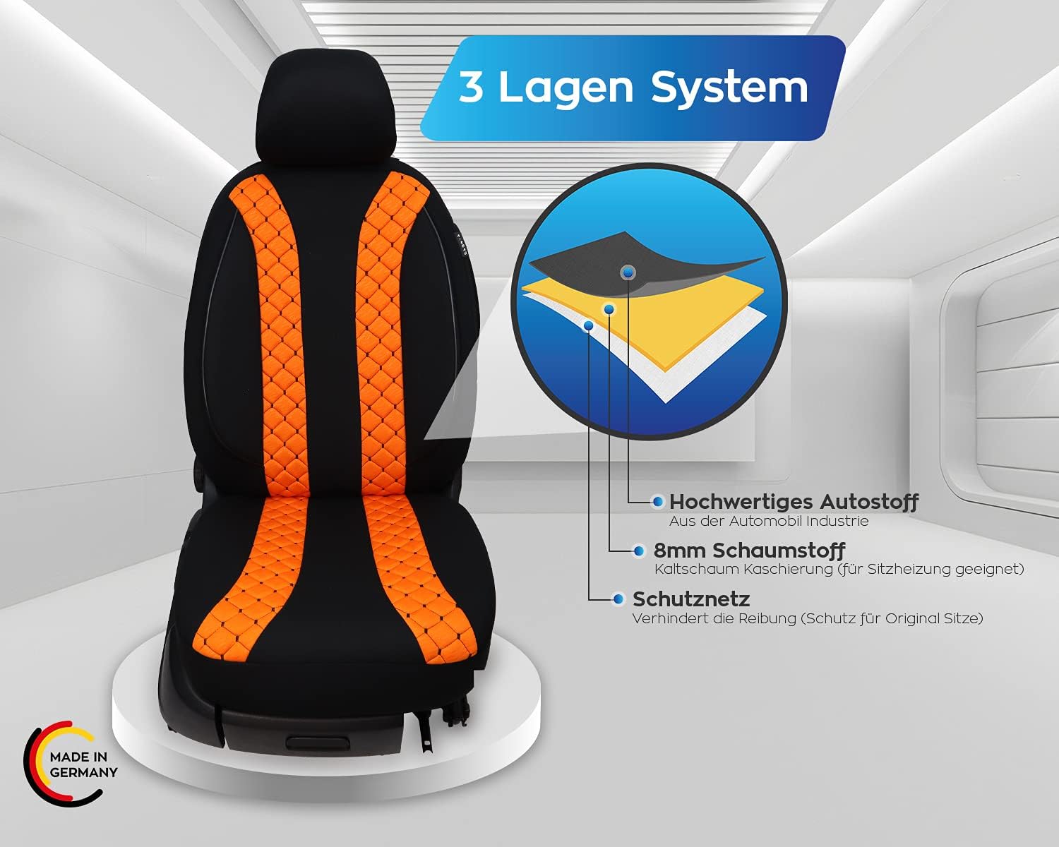 - Extras - 3 Lagen System, Sitzbezüge für Airbag und Sitzheizung geeignet, Rückenseite der Vordersitze mit grosszügigen Taschen ausgestattet, komfortables & sportliches Sitzgefühl